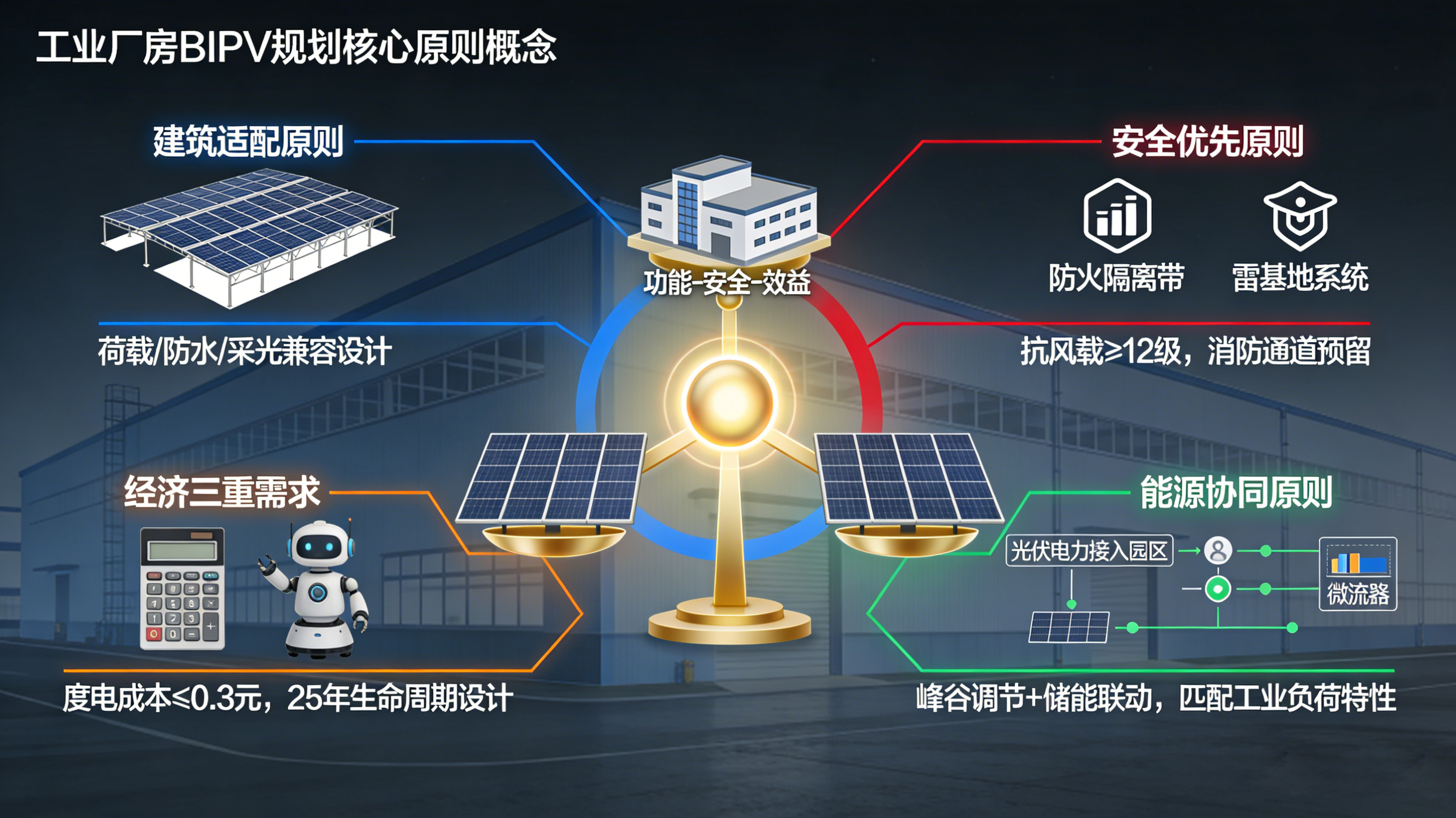 工业厂房BIPV的规划并非单纯追求光伏装机容量,需结合工业生产的刚性需求、厂房建筑的结构特性及零碳园区的能源目标,遵循四大核心原则,确保项目兼具实用性与可持续性。