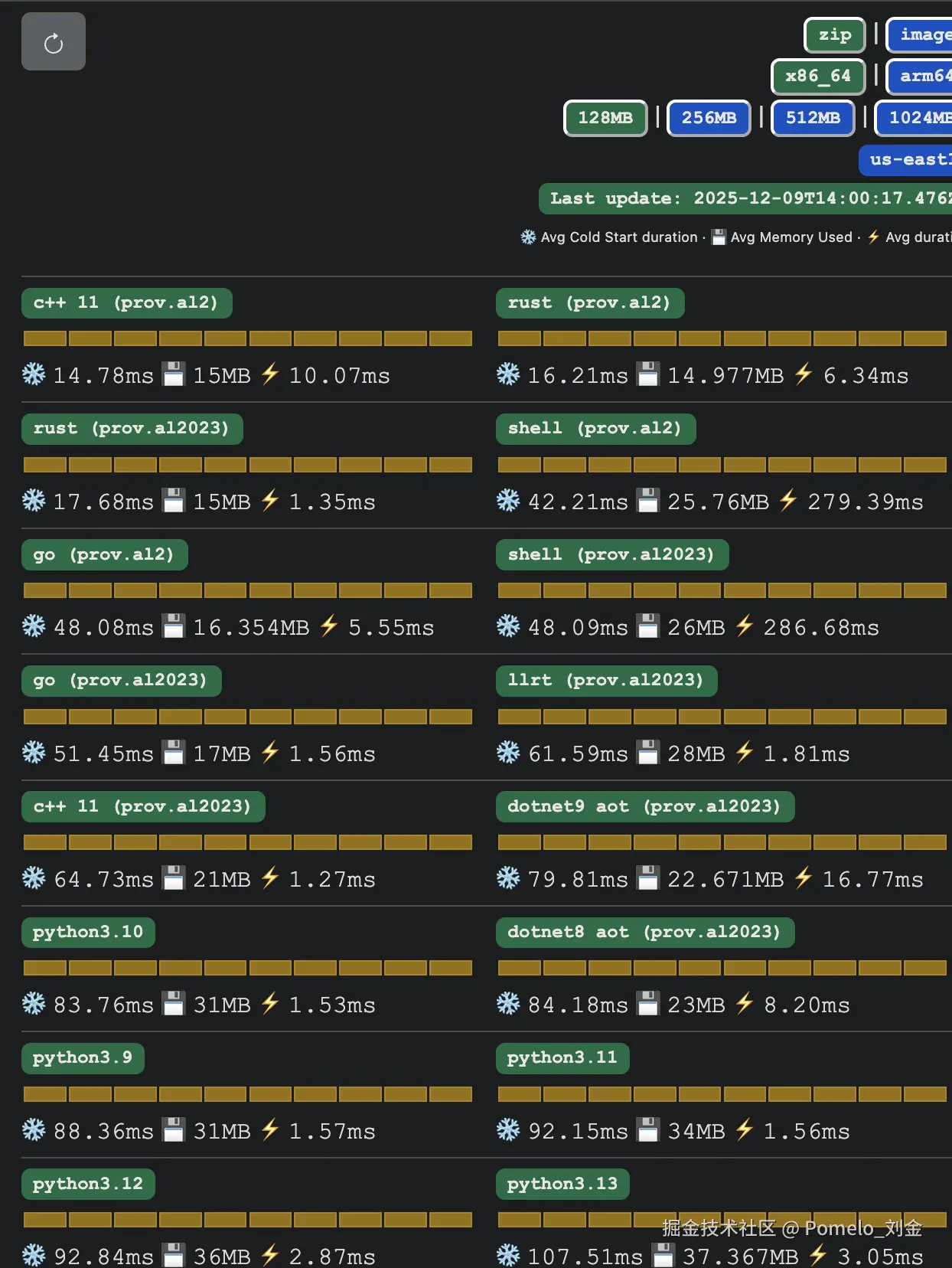 AWS Lambda 冷启动时间(Serverless 场景)"冷启动"就是你的程序从"沉睡"到"完全唤醒并开始工作"所需的时间。