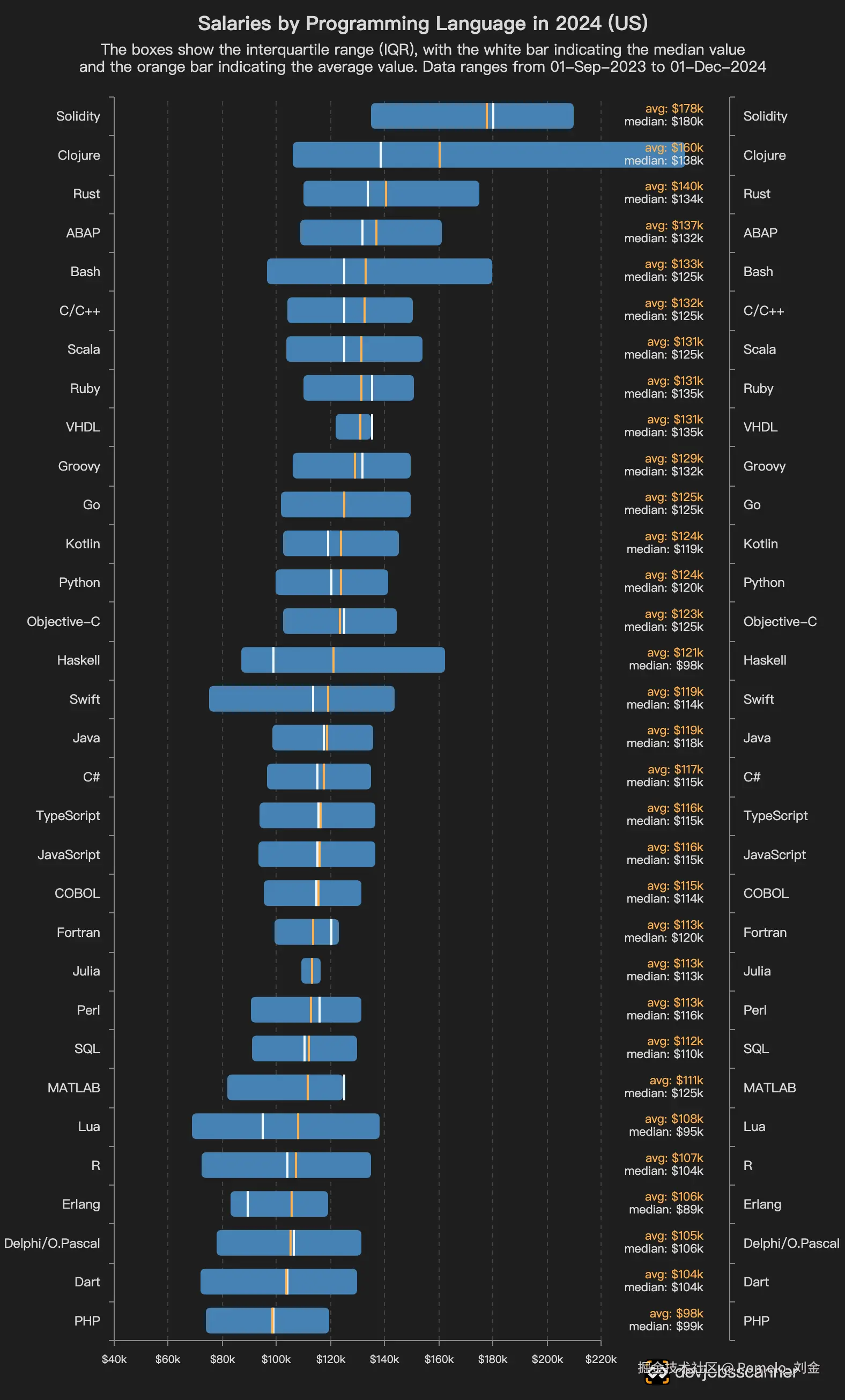 来看一个 2024-2025 年 不同编程语言薪资水平 数据