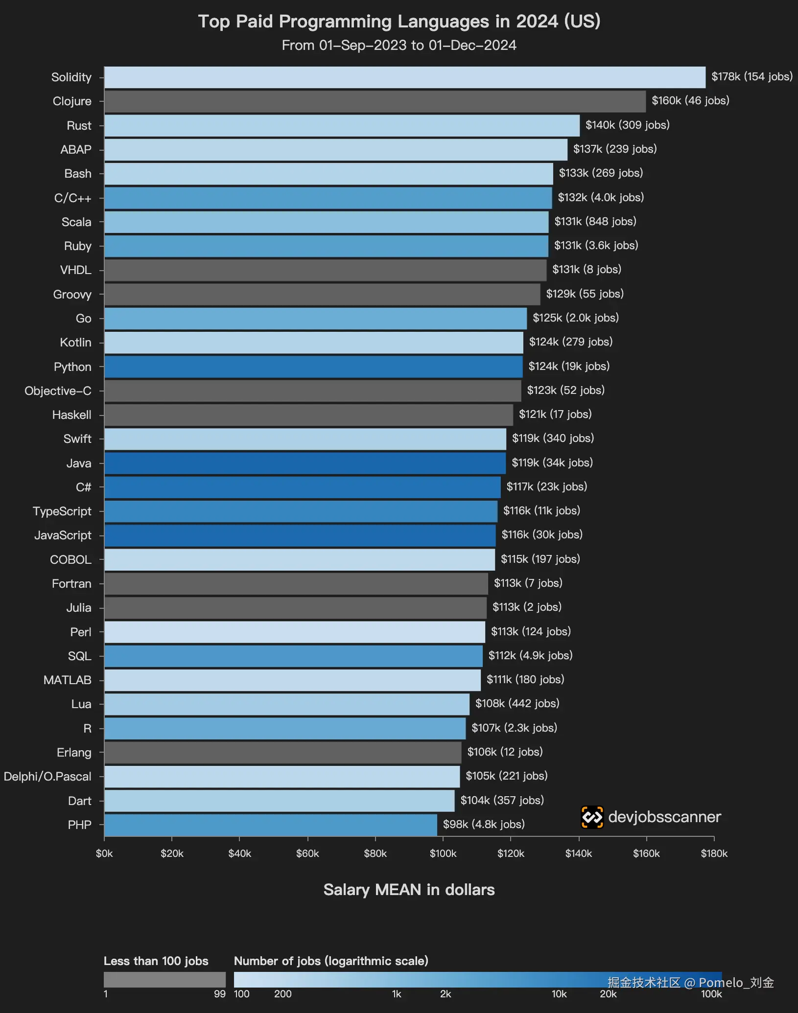 数据分析平台 DevJobsScanner 分析了来自世界各地超过 1000 万个开发职位,以帮助我们了解市场以及最热门、薪资最高的语言。在本研究中,仅关注来自美国的职位。这确保了结果更加一致和具有代表性,并显著降低了任何潜在的数据偏差