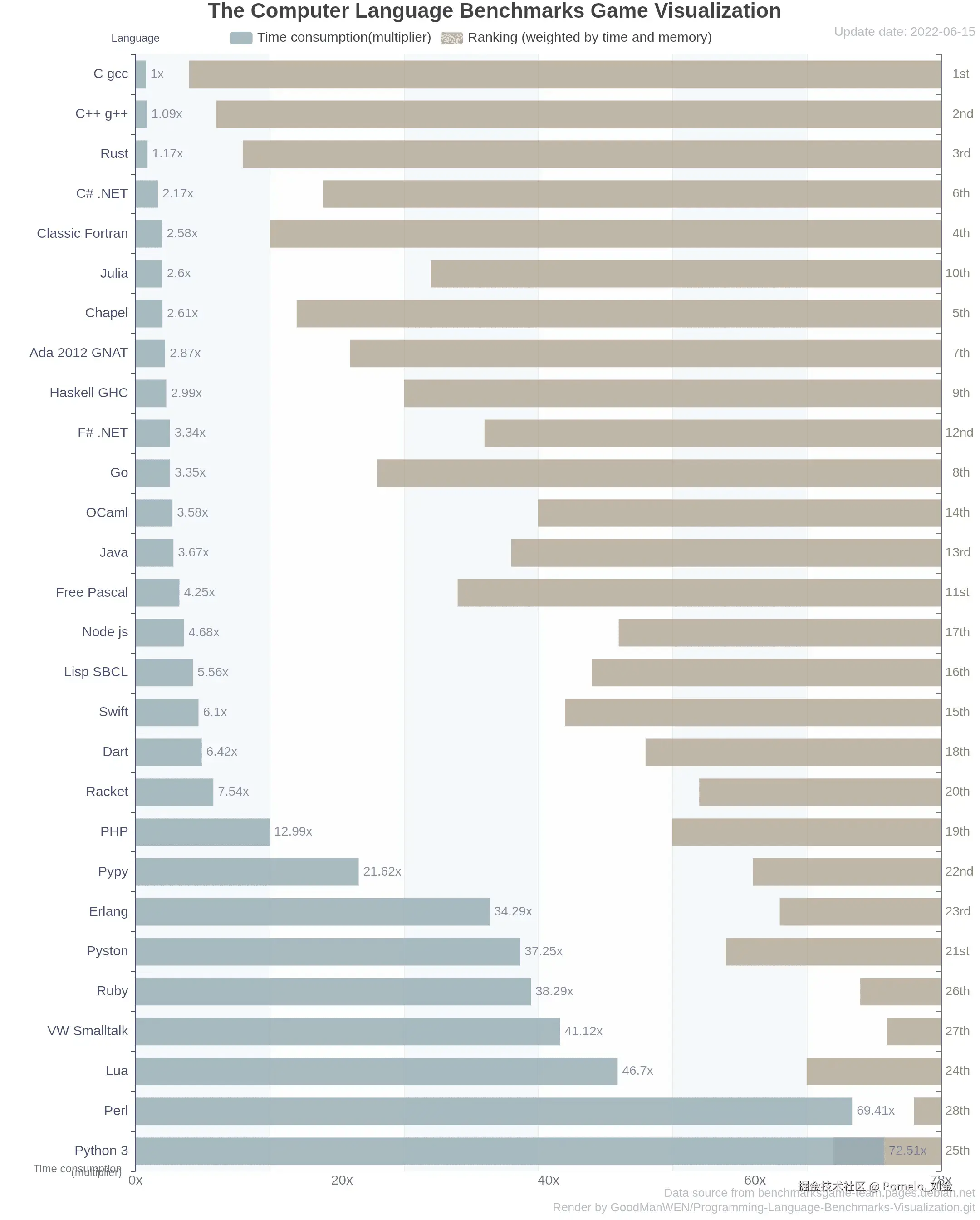 开发者根据 The Benchmarks Game 的测试数据制作了一份可视化图表,如下所示,灰色反映的是时间效率,越短代表性能越好,棕色则是基于执行时间和内存开销的加权值。 (计算机语言基准测试游戏(以前称为计算机语言大比拼)是一个自由软件项目,用于比较给定的简单算法子集如何在各种流行的编程语言中实现。)