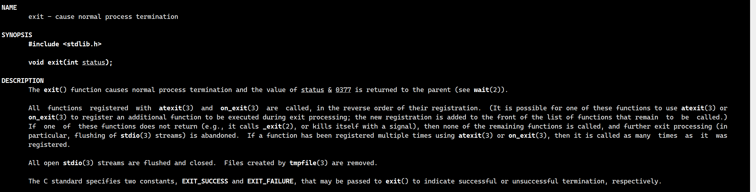 exit是一个C库函数,作用是使当前进程终止,参数是想要返回的退出码
