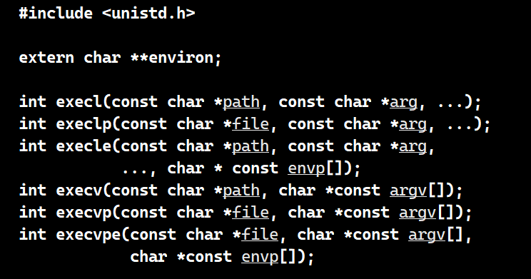 不难想到,exec系列函数通过上面不同的参数组合,有了六种函数,以应对不同的使用场景: