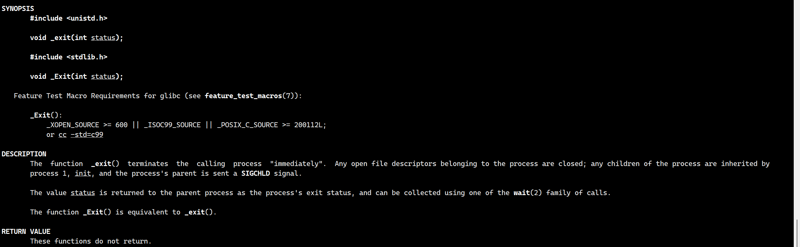 _exit是一个系统调用,它和exit的唯一区别是exit终止会强制刷新缓冲区,但_exit不会。