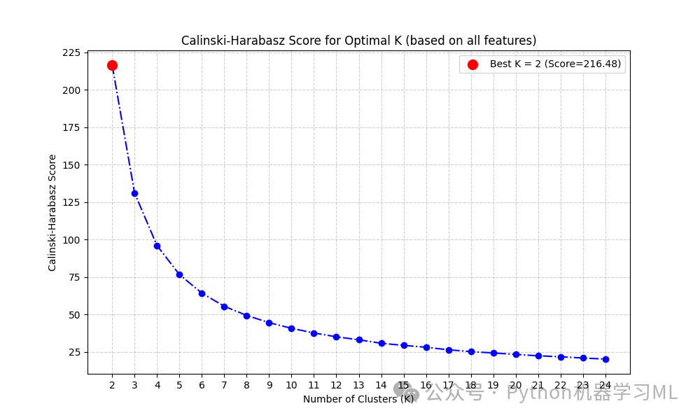 - 根据肘部法则或 CH 指数选择一个"最优"的 K。代码隐式地选择了使 CH 分数最高的 K,并存储了对应的聚类标签