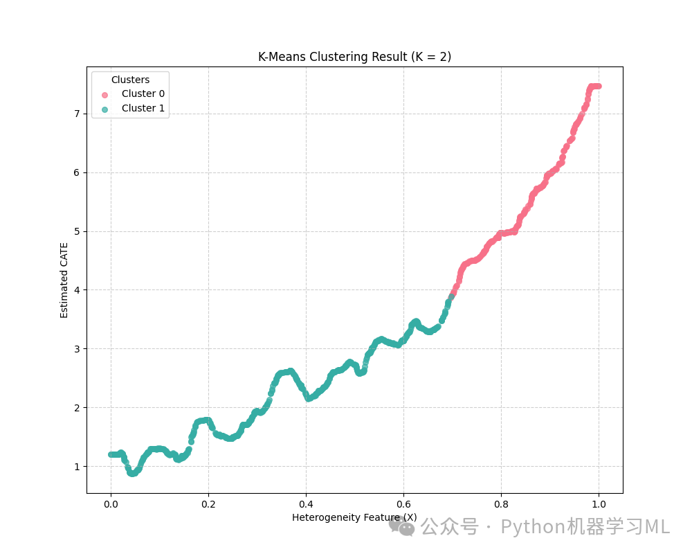 如果对发现具有相似效应模式的子群体感兴趣,可以像教程中那样,使用估计出的 CATE 或其他相关特征进行聚类分析(如 K-Means)。