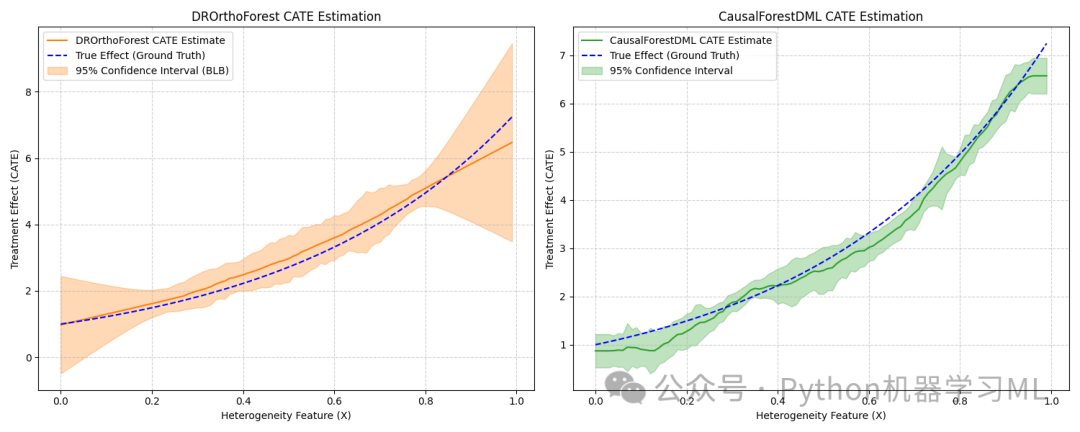 绘制 CATE(x) 随某个重要特征 x 变化的曲线图(类似教程中的做法),并带上置信区间。这有助于直观理解异质性。