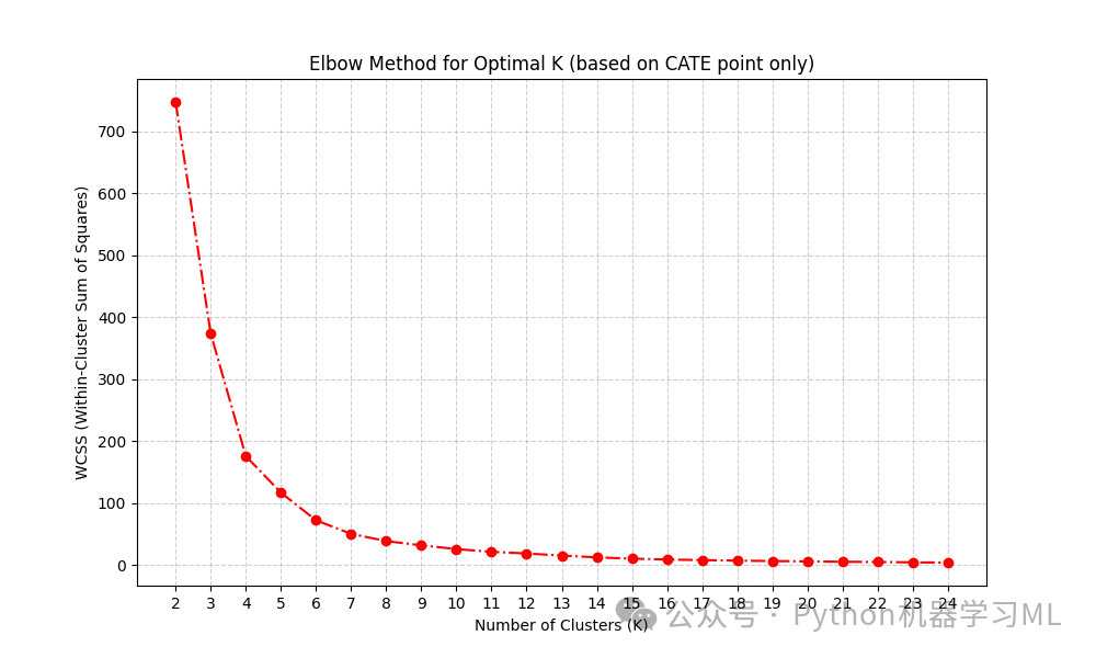 # 尝试 K 从 2 到 24print("\nEvaluating different numbers of clusters (K)...")k_range = range(2, 25)for i in k_range: # 1. 使用 CATE 点估计进行 K-Means,计算 WCSS (用于肘部法则) # 注意:这里只用了 CATE 点估计 point_orig (来自训练集) 作为特征 kmeans_pca = KMeans(n_clusters=i, init='k-means++', random_state=42, n_init=10) # n_init=10 多次初始化选最优 kmeans_pca.fit(point_orig.reshape(-1, 1)) # 需要 reshape 成 N x 1 的二维数组 wcss.append(kmeans_pca.inertia_) # inertia_ 属性就是 WCSS