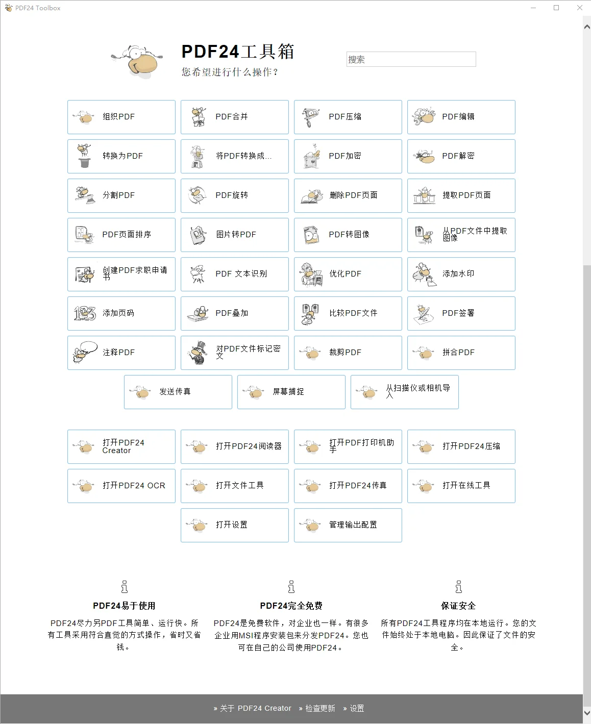整体来看,PDF24 Creator 集成了丰富的PDF操作能力,涵盖编辑、打印、多格式转换、压缩优化、文本识别及图文叠加等多方面功能,满足用户对PDF文件的全面需求,是一款功能强大且使用便捷的PDF工具集。