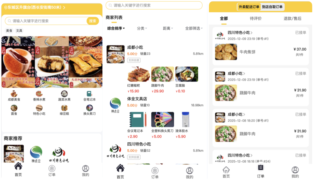 全链路订单追踪:从"商家已接单"到"骑手配送中",再到"已送达",每个状态实时更新,用户可随时联系商家或骑手。