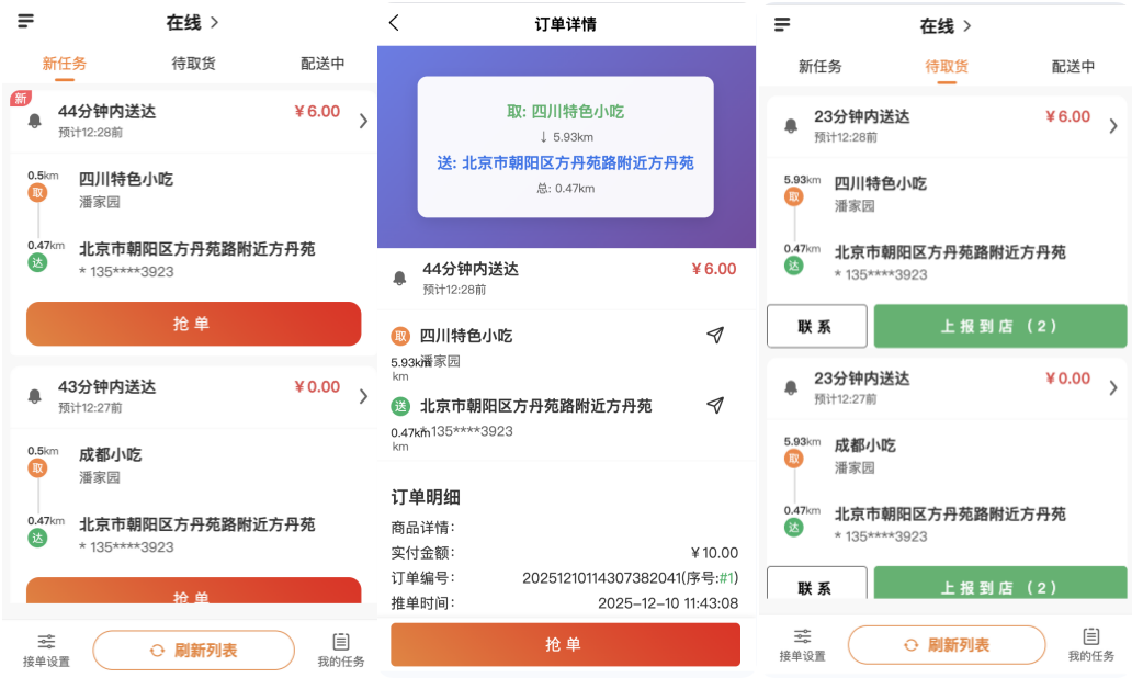 多渠道订单获取:系统同时支持平台派单与骑手"抢单"两种模式,兼顾效率与灵活性。