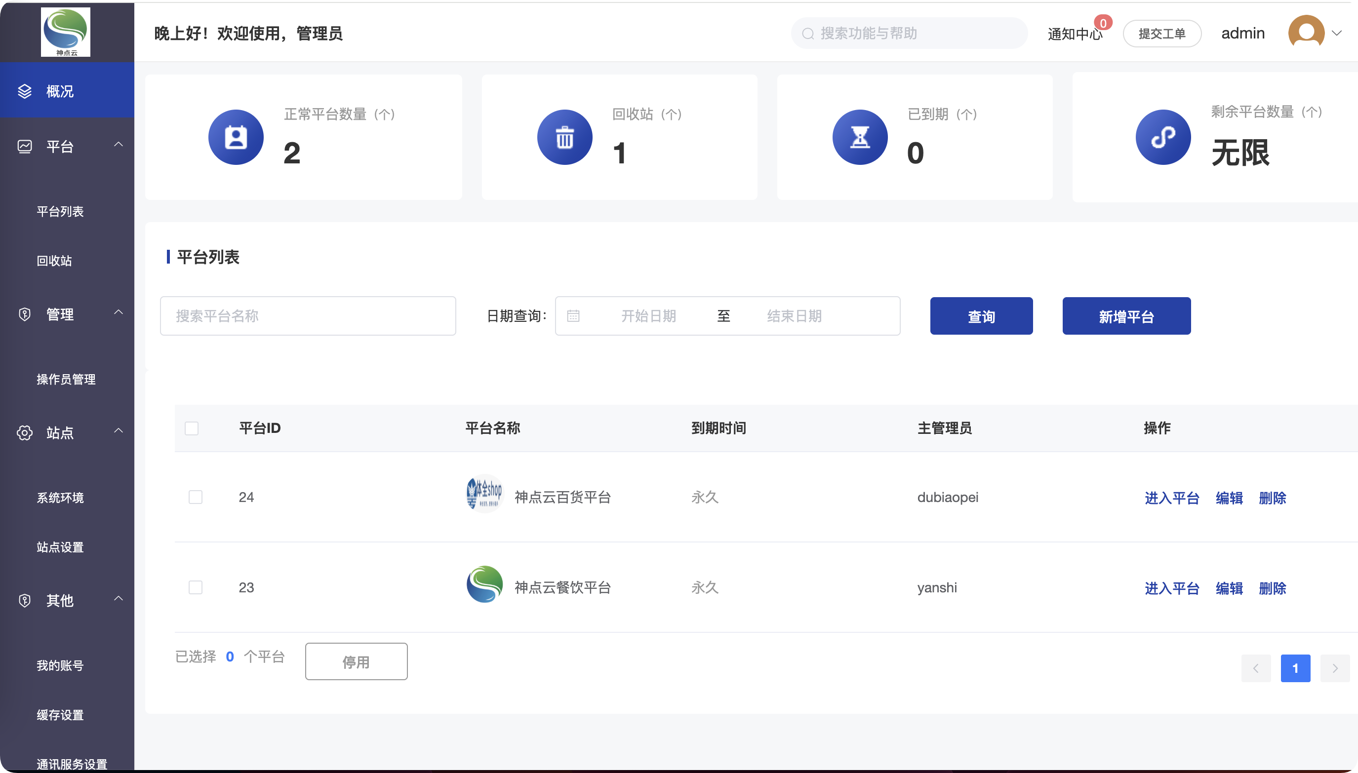 平台级多站点管理 :支持创建并管理多个独立运营的子平台(如"餐饮平台"、"百货平台"),实现一套系统支撑多品牌、多业务线,支持无限开设平台。