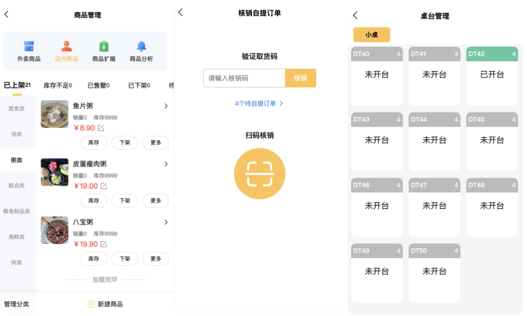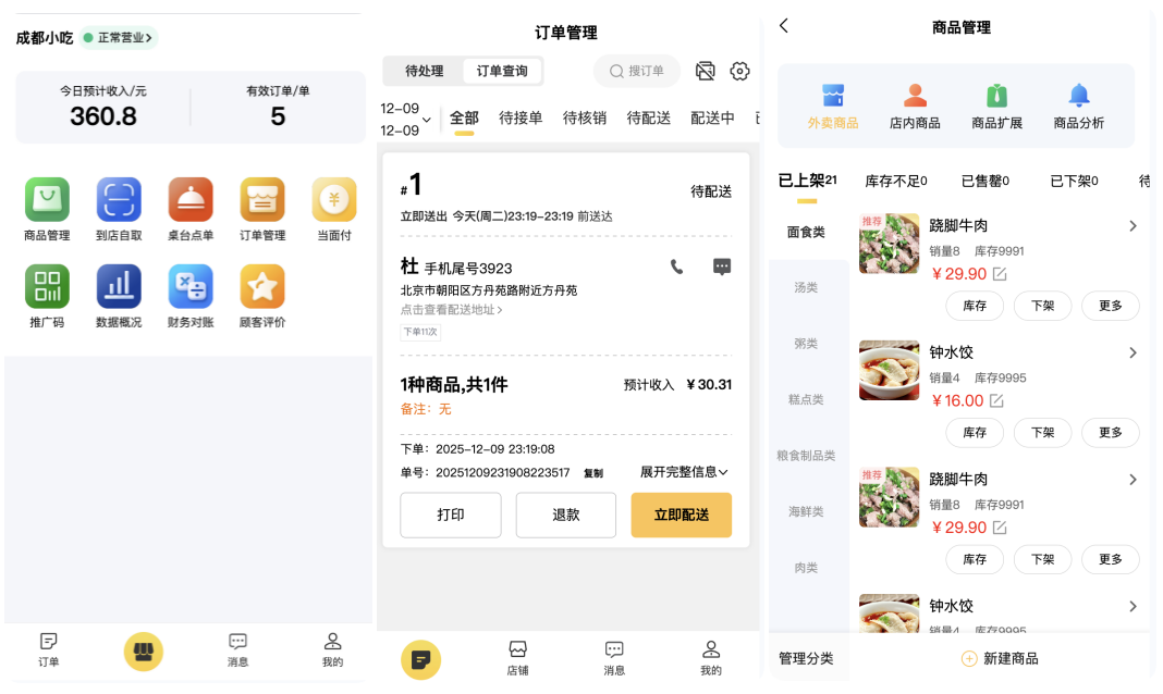 高效订单处理:订单自动聚合,按"待处理"、"待接单"、"配送中"等状态清晰划分。支持一键接单、打印小票、发起配送,堂食订单还可进行"扫码核销"与"开台管理"。