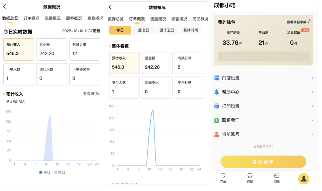 核心经营仪表盘:商家登录后台,首页即可纵览"今日预计收入"、"有效订单"、"商品数"等核心数据总览,经营状况一目了然。