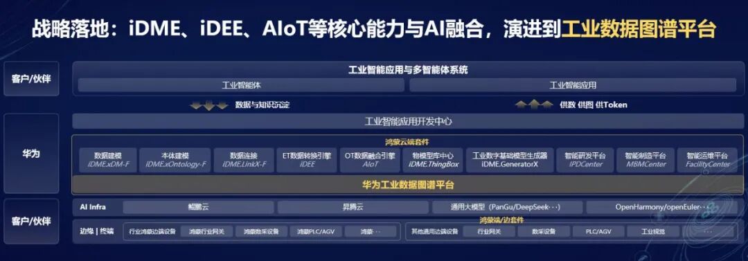 随着AI技术的爆发,华为在工业领域适时地做了战略重心调整:从"补短板"转向"锻长板",在"ALL IN AI"战略牵引下,全力聚焦于让工业数据通过AI释放最大价值。这一目标的实现,根植于一条清晰的演进路径------华为以iDME作为统一的工业数据管理底座,遵循"数据统一→知识沉淀→平台整合"的三层演进逻辑,深度融合华为内部数智化转型经验与行业实践Know-How,系统性集成iDME、iDEE、AIoT等产品能力,升级打造了工业数据图谱平台。其中,iDME解决了"数据统一"问题,iDEE+AIoT促进了"数据采集与流转",再通过工业数据图谱平台实现"全场景(IT/OT/ET/KT)数据全联接全融合"与知识抽取,完成"数据到知识的沉淀",从而构建起支撑工业智能的核心数据底座。