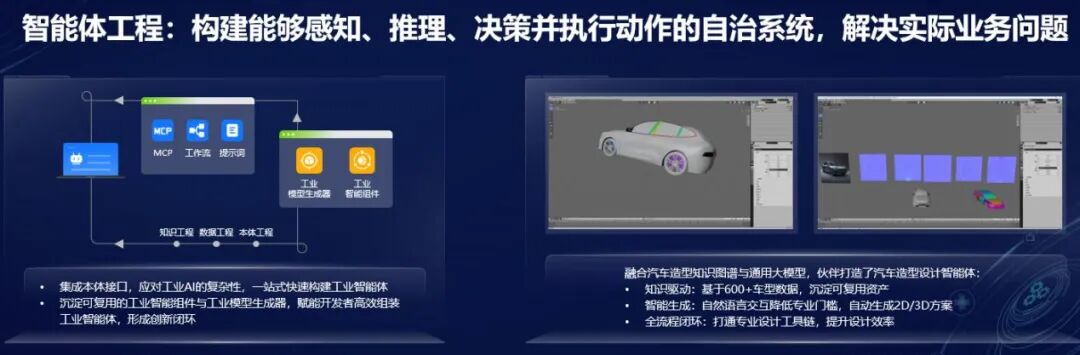 4.智能体工程:基于"工业智能应用开发中心"提供的一站式AI Agent开发能力,支持汽车造型智能设计、电子电路Symbol库智能生成等场景,推动AI在工业领域的场景化应用落地。