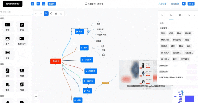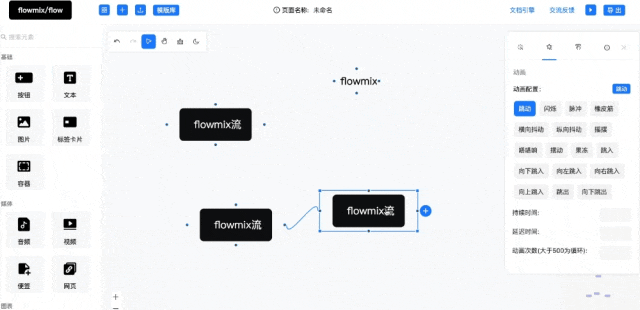 目前整套设计架构支持了多种类型的属性编辑, 比如样式 , 数据 , 动画等, 动画目前支持了海量的动画素材, 可以轻松给节点配置不同的动画效果, 并设置动画的时长, 次数等.