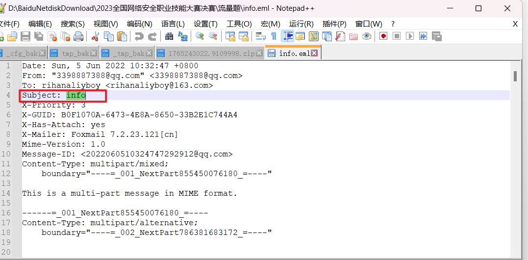 Subject: 后面的内容即为收件人看到的邮件标题(主题)。这是 SMTP 和 MIME 邮件标准(RFC 5322)中定义的正式字段。