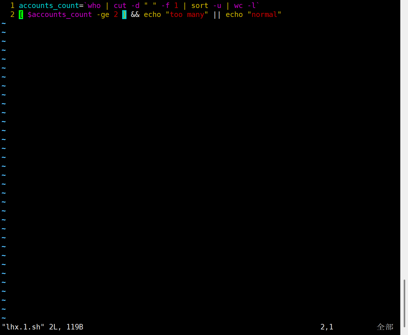 1.判断当前系统中已登录账户数,若大于等于2个则输出"Too many" 否则输出" normal"