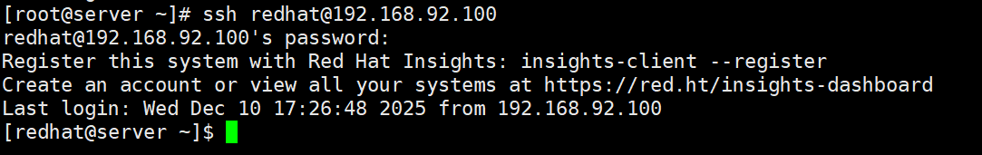 为了验证是否能检测出两个用户,在Xshell中再打开一个窗口并远程连接上用户redhat