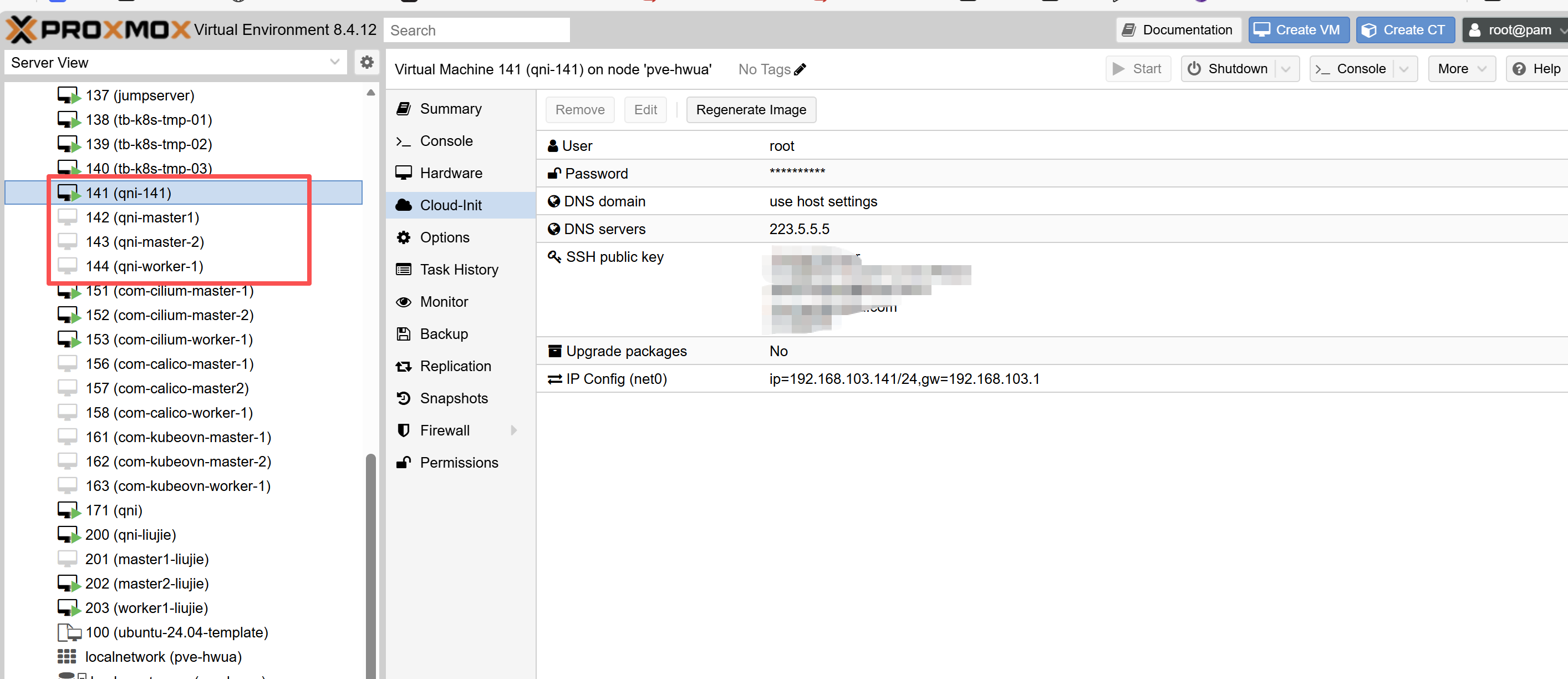 为了清晰可见,可以通过exsi或者pve,做4个vm(最低要求8核16G),创建好后,截图如下: