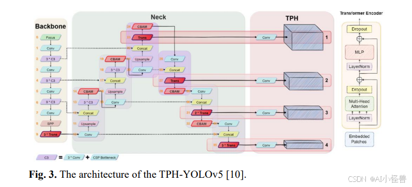 一些研究探索了修改网络架构以增强小目标检测。在[8]中,引入了一种新颖的检测头来生成更高分辨率的特征图,同时在骨干网络末端集成了一个注意力机制。这种方法在保留关键空间信息的同时减少了计算开销。此外,还提出了一种新的损失函数以提高检测精度。类似地,在[9]中,探索了修改YOLO架构的方法,用基于Transformer的检测头(Transformer Prediction Head,TPH)替代了传统的四个检测头。这种自注意力机制提升了预测精度,同时采用了卷积块注意力模块(CBAM)来强调密集场景中的关键区域。该研究还利用数据增强、多尺度评估和模型集成来进一步提高检测性能。下图展示的TPH-YOLOv5架构增强了对VisDrone2021数据集的微小目标检测能力。