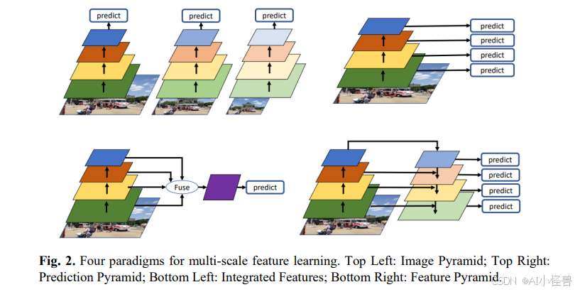 网络架构。 多尺度目标检测方法主要分为四类:图像金字塔、预测金字塔、集成特征和特征金字塔[5]。