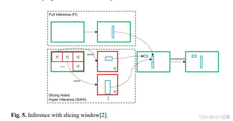 滑动窗口。 滑动窗口法将图像分割成重叠的切片,然后由目标检测网络处理。将所有切片的结果合并以产生最终的检测输出。虽然这种方法提高了精度,但显著增加了计算时间,使其不太适合实时应用。SAHI框架[23]是该领域一项稳健且有效的工作,主要关注滑动窗口技术,该技术可在训练和推理阶段使用。此外,研究[47]提出了一个框架,与现有方法相比,优化了计算成本并减少了推理时间。在该研究中,切片尺寸与输入图像大小相关联,使切片数据的模型参数能与主数据集保持一致的比率。已经开发了几种基于分块的方法来增强目标检测,特别是在具有挑战性的场景中的小目标检测。例如,EdgeDuet框架[24]利用一系列关键步骤,包括瓦片级并行处理,通过解压缩不含小目标的块并通过重叠分块优化检测,从而更高效地处理视频帧。此外,另一项研究[25]专注于使用高分辨率图像从微型飞行器检测行人和车辆,采用一种在训练和推理阶段都能提高精度的分块方法。该方法有效减少了细节损失,同时确保模型接收固定尺寸的输入,在Nvidia Jetson TX1和TX2等平台上,配合VisDrone2018数据集,展现了显著的性能提升。这些技术反映了目标检测领域旨在克服传统处理方法局限性的持续创新。