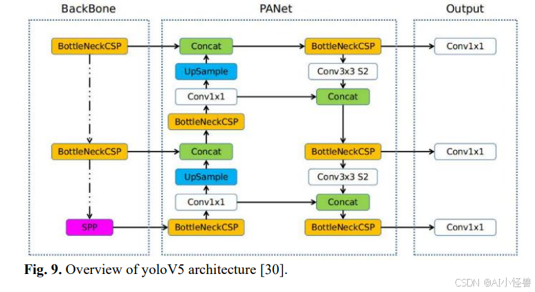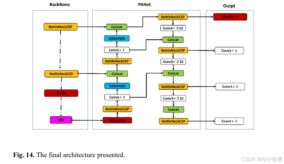 本研究对YOLO架构进行了多项增强,专门针对小目标检测进行了优化。受[8]的启发,这些旨在提升精度和计算效率的改进在三个主要层面实施:为小目标增加新的检测头、集成卷积块注意力模块(CBAM)以及利用involution块进行高级特征提取。YOLOv5的基础架构如图9所示。这些架构修改被整合到YOLOv5基础模型中,最终的增强型YOLOv5架构如图14所示。