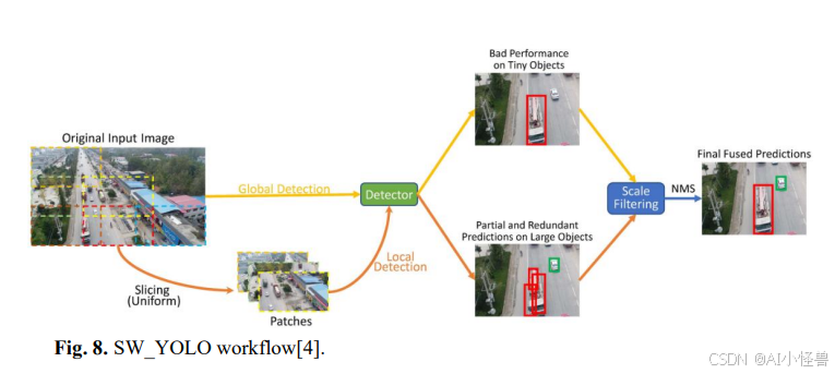 SW_YOLO[4]提出了一种高效的无人机目标检测框架,旨在应对密集集群、目标重叠和尺度多样性等挑战。其方法采用统一的切片窗口法,将输入图像分割成较小的图块以检测小目标,同时保持效率。该框架包括对完整图像的全局检测和对子图块的局部检测,以处理不同尺度的目标。一个尺度过滤机制将目标分配给适当的检测任务以保持尺度不变性。此外,该方法使用随机锚点裁剪进行数据增强,用多样化的场景丰富训练数据。通过两种定制的增强方法模拟具有密集目标集群的真实世界场景,尤其有助于检测稀有类别。综合实验表明,与其他方法相比,这种方法以更低的计算成本显著提高了检测性能。SW_YOLO的工作流程如图所示。该框架作为评估我们提出方法的基线。