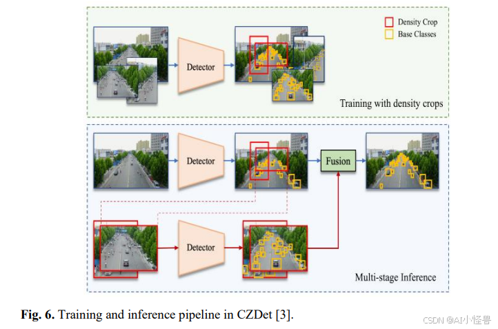 现有的针对杂乱区域目标检测的方法通常依赖于分割密集区域或聚类技术,由于需要额外的可训练模块或处理单元,这些方法可能非常耗时。为了解决这个问题,CZDet[3]提出了一种解决方案,即由检测网络本身识别杂乱区域,从而避免了额外的模块。随后,这些被识别出的区域会以更高的精度进行重新评估,从而提升了较小目标的检测精度。训练和推理流程在图6中完整展示。