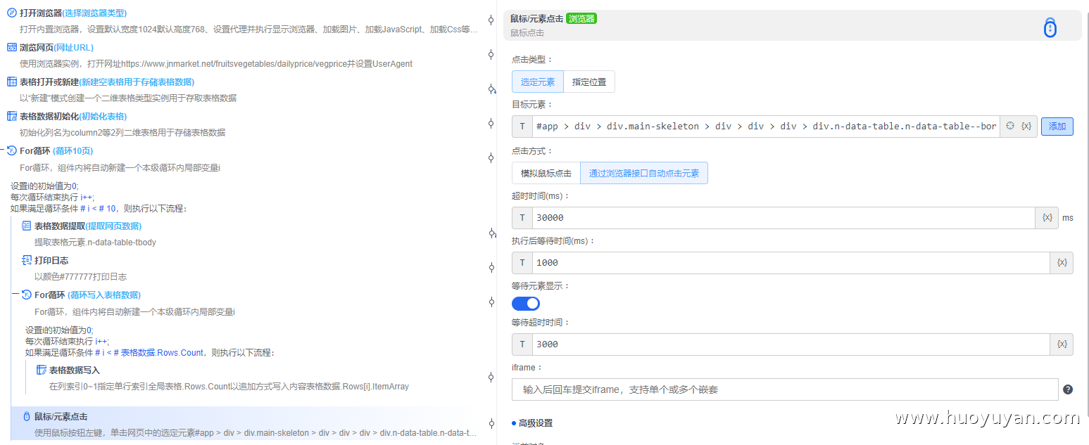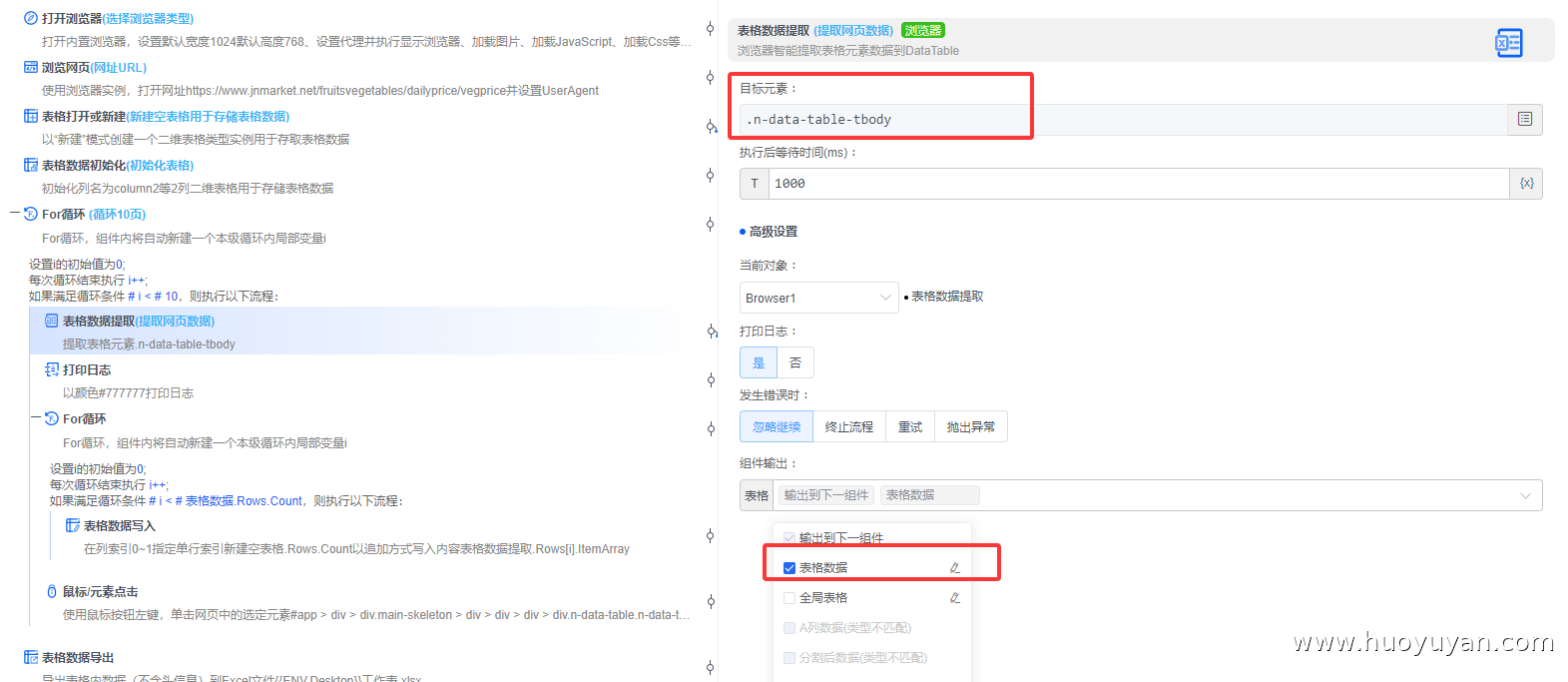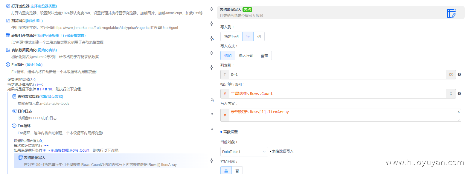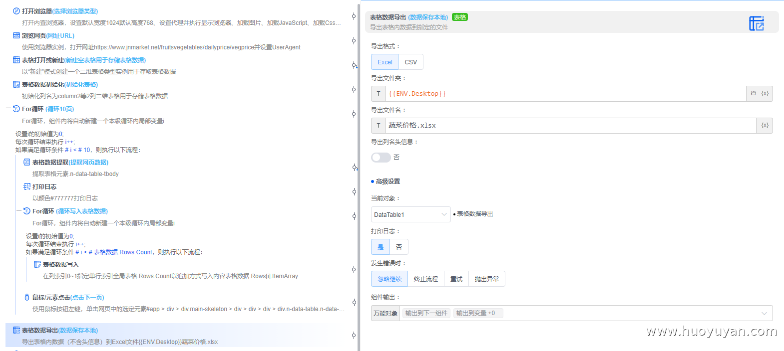 在火语言 RPA 爬取网页数据时,很多新手只知道用「获取多元素信息属性值」「获取单元素信息属性值」逐个抠取数据?其实面对网页表格类数据时,用「表格数据提取」组件也是不错的选择!不用逐行逐列手动定位元素,不用反复配置属性值,一键就能抓取整表数据。今天就以爬取 10 页蔬菜价格为例,手把手拆解「表格数据提取」组件,新手也能轻松搞定多页表格数据采集~