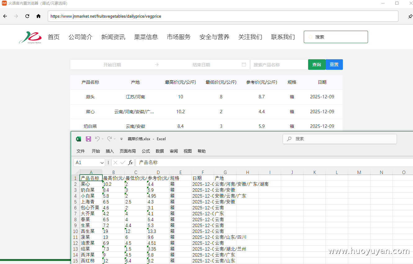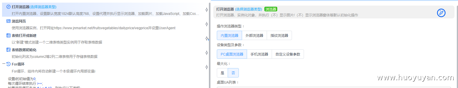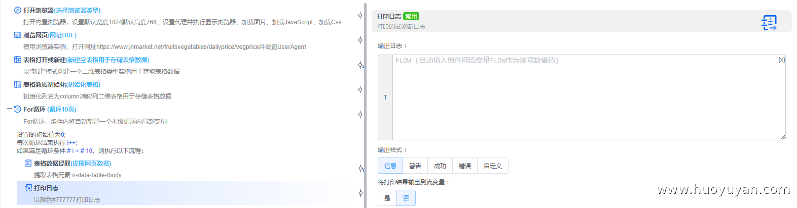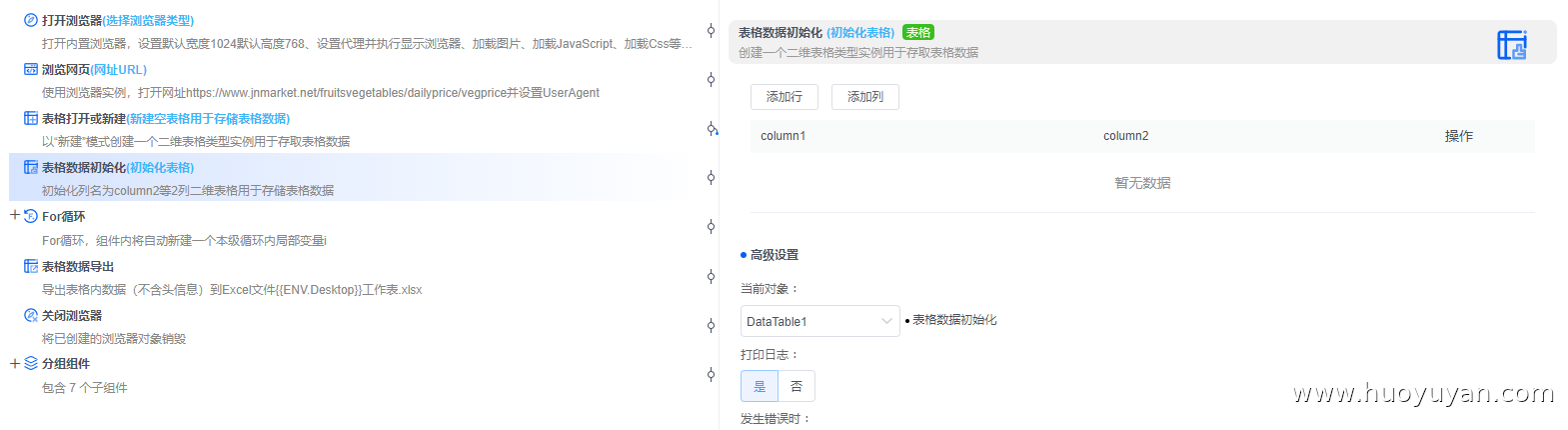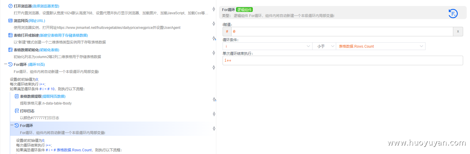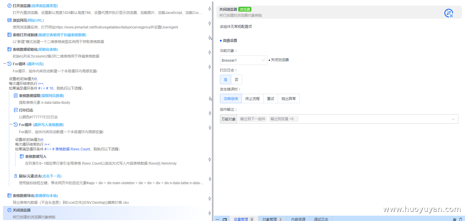 在火语言 RPA 爬取网页数据时,很多新手只知道用「获取多元素信息属性值」「获取单元素信息属性值」逐个抠取数据?其实面对网页表格类数据时,用「表格数据提取」组件也是不错的选择!不用逐行逐列手动定位元素,不用反复配置属性值,一键就能抓取整表数据。今天就以爬取 10 页蔬菜价格为例,手把手拆解「表格数据提取」组件,新手也能轻松搞定多页表格数据采集~