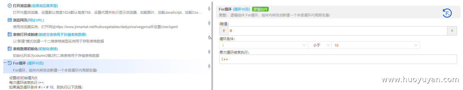 组件5,For循环 ,因为这里采集10页数据,所以这里循环条件为:i<10