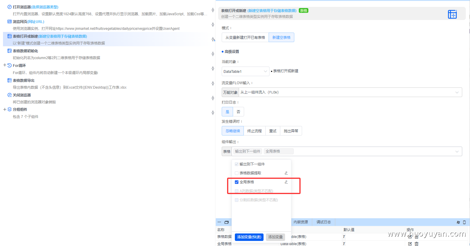 组件3,表格打开或新建 ,新建空表格,用于存储表格数据,这里我们把新建的表格输出到变量全局表格,用于后续写入表格数据