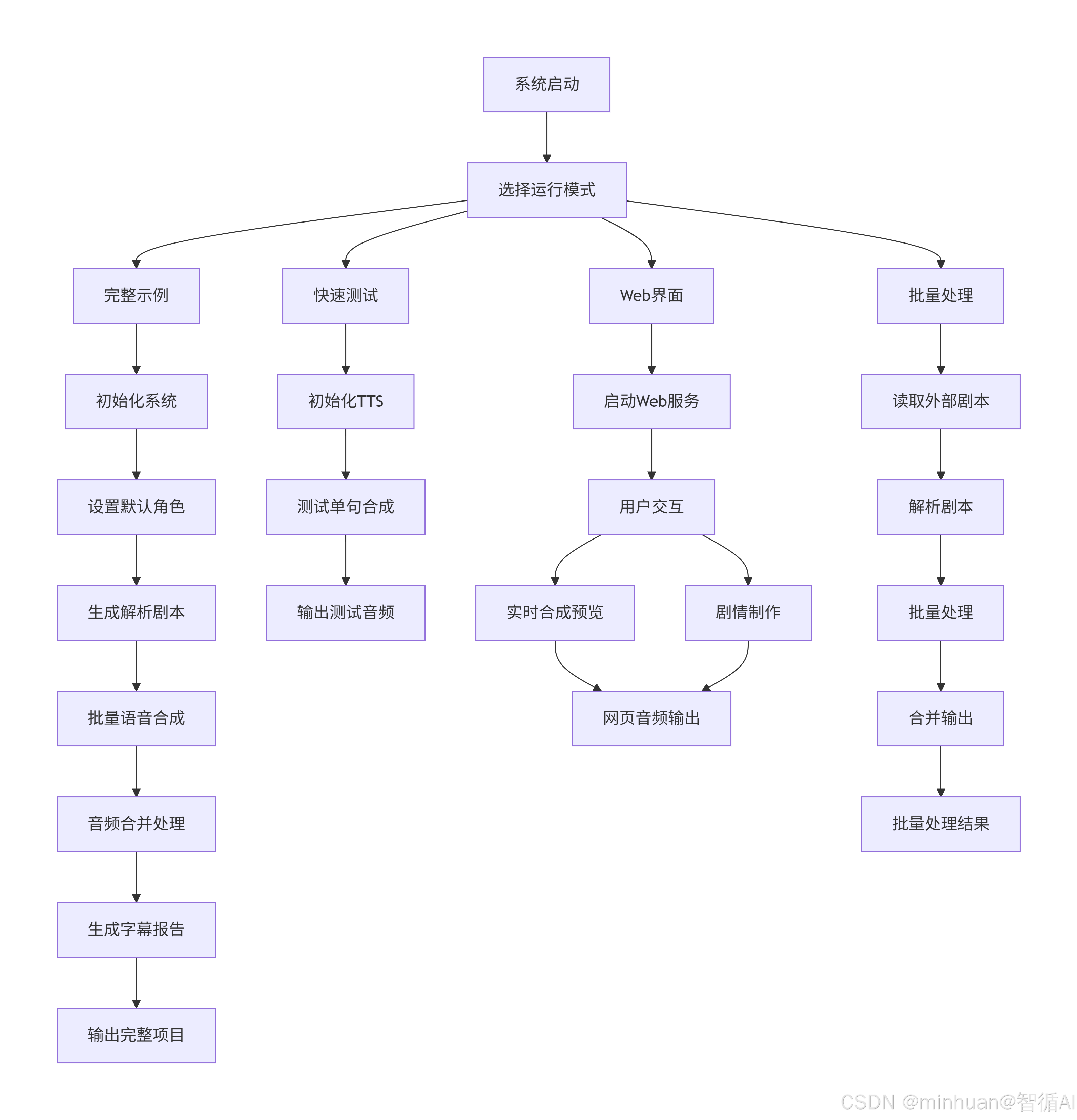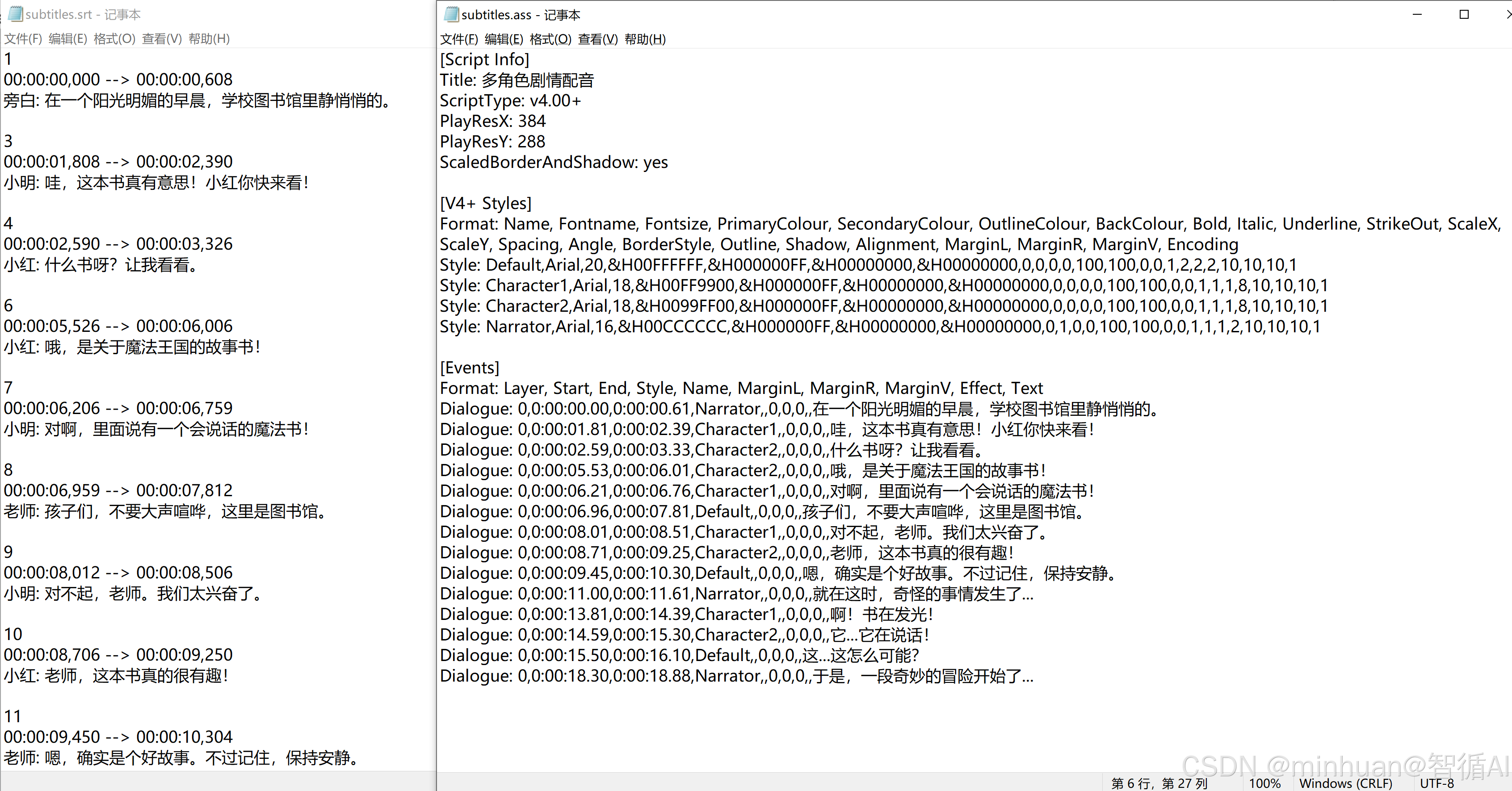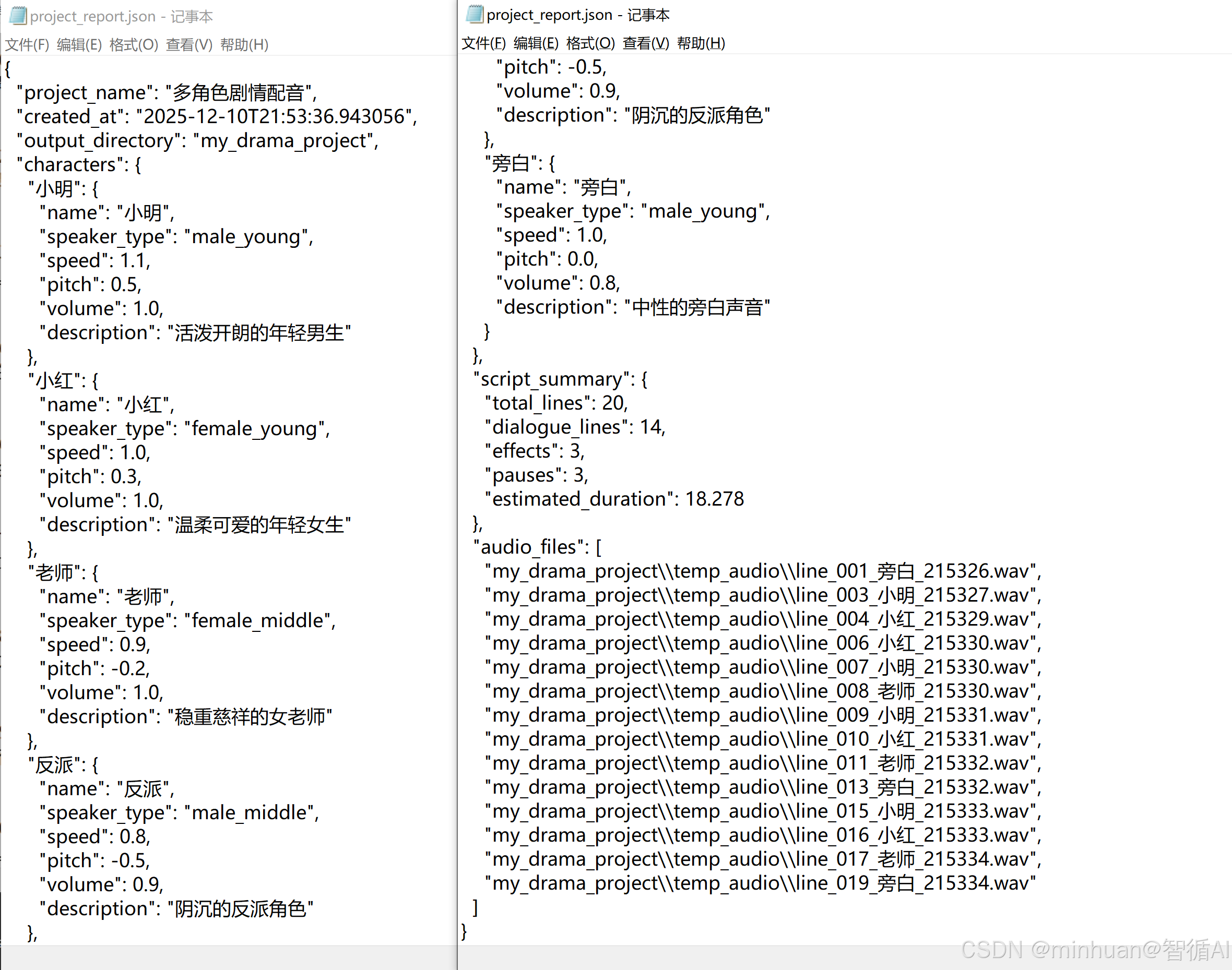 系统的核心示例围绕 "校园魔法冒险" 剧情展开:以小明、小红、老师、魔法书等角色构建短剧情,通过不同音色(青年男 / 女、中年女)、语速、音调的定制化合成,搭配音效 / 停顿指令,生成完整的剧情音频,并自动输出 SRT/ASS 字幕与项目报告,直接适配短视频制作流程。