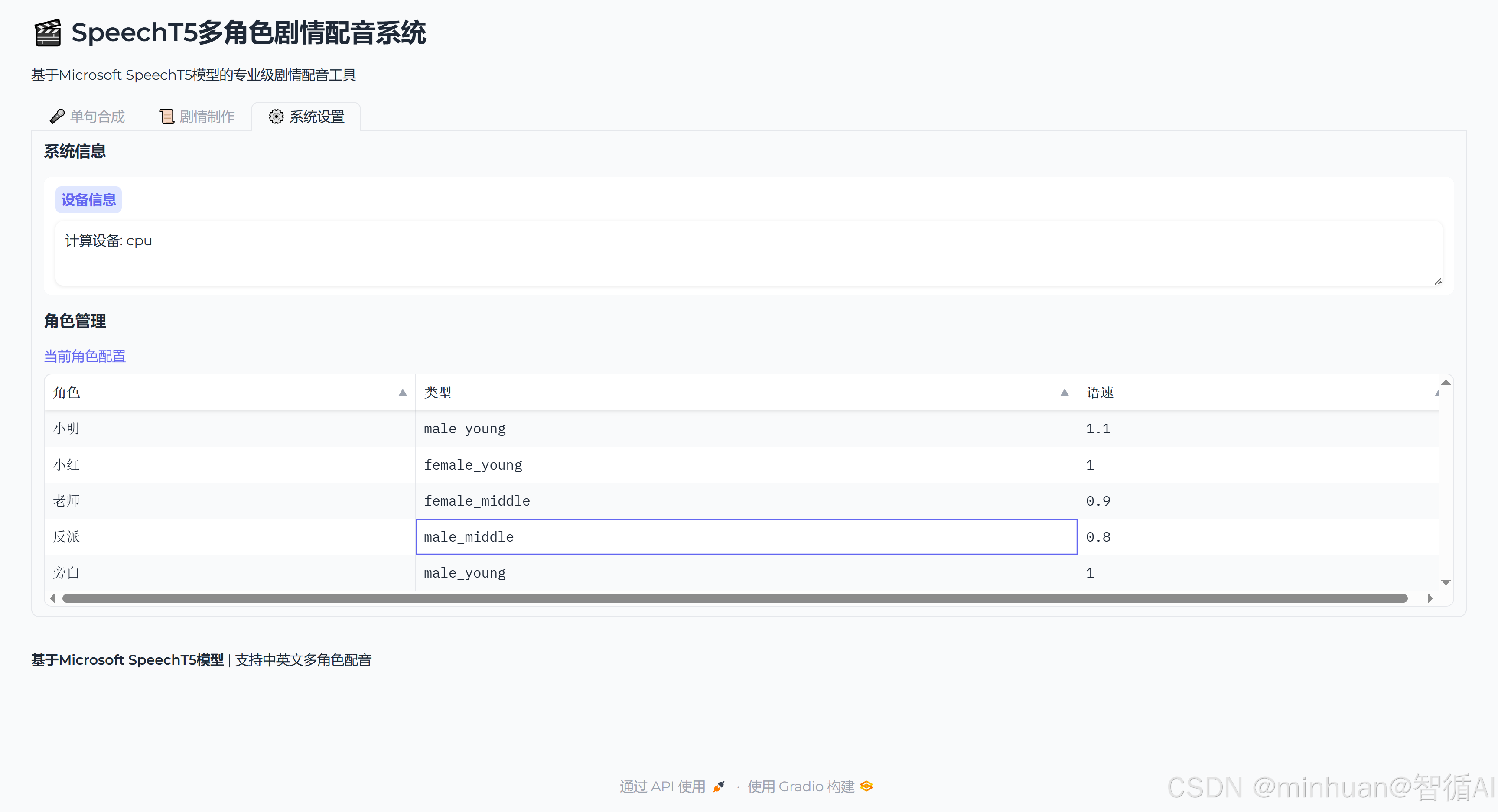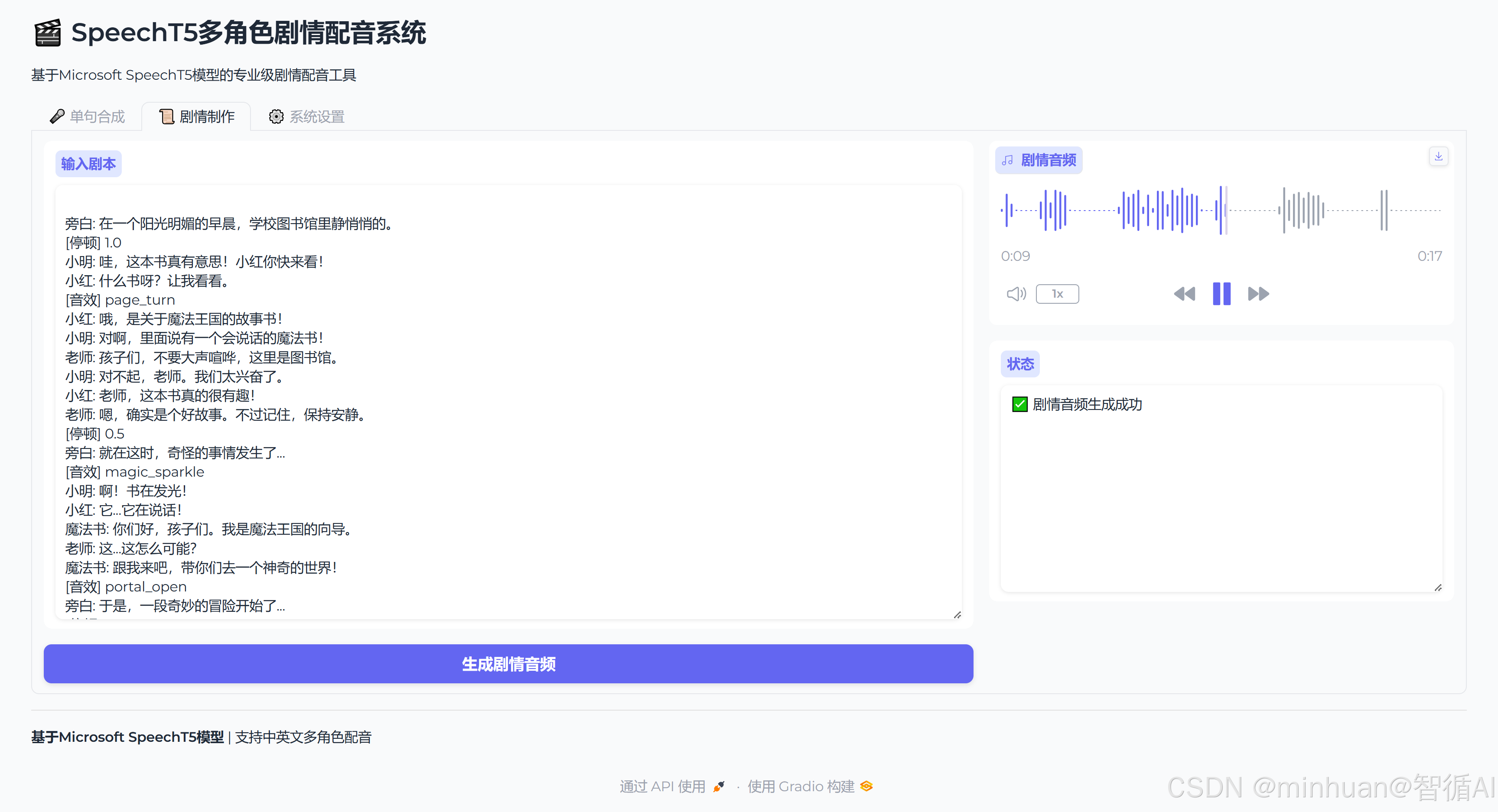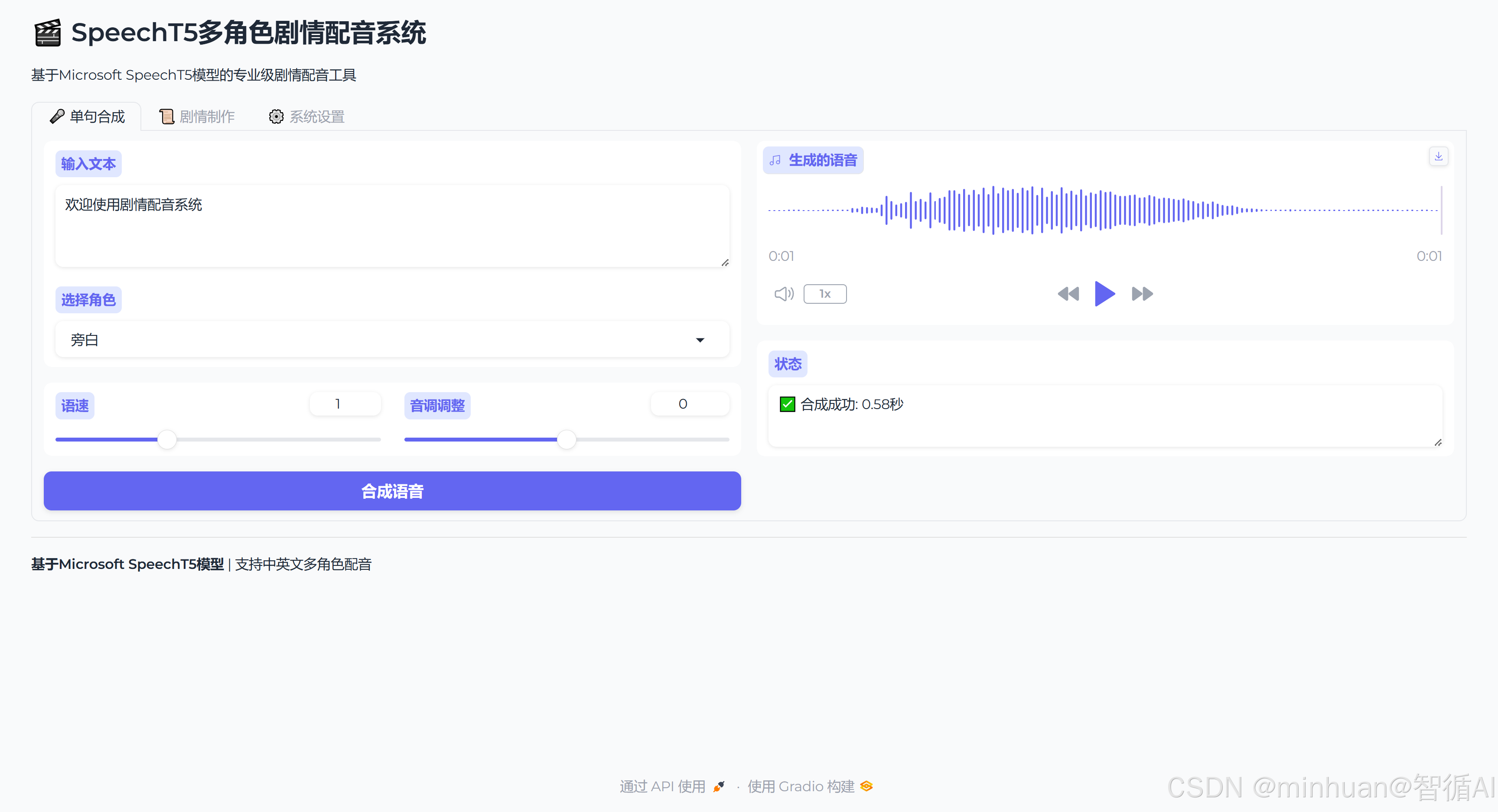 今天我们基于SpeechT5 模型构建一套自媒体多角色剧情配音系统,正是针对上述痛点的可落地解决方案。该系统以 SpeechT5 为核心引擎,支持中英文多角色配音,覆盖 "剧本解析→语音合成→音频拼接→字幕生成→项目报告" 全流程,还提供 Web 可视化界面与批量处理能力,完全适配自媒体小团队的配音需求。