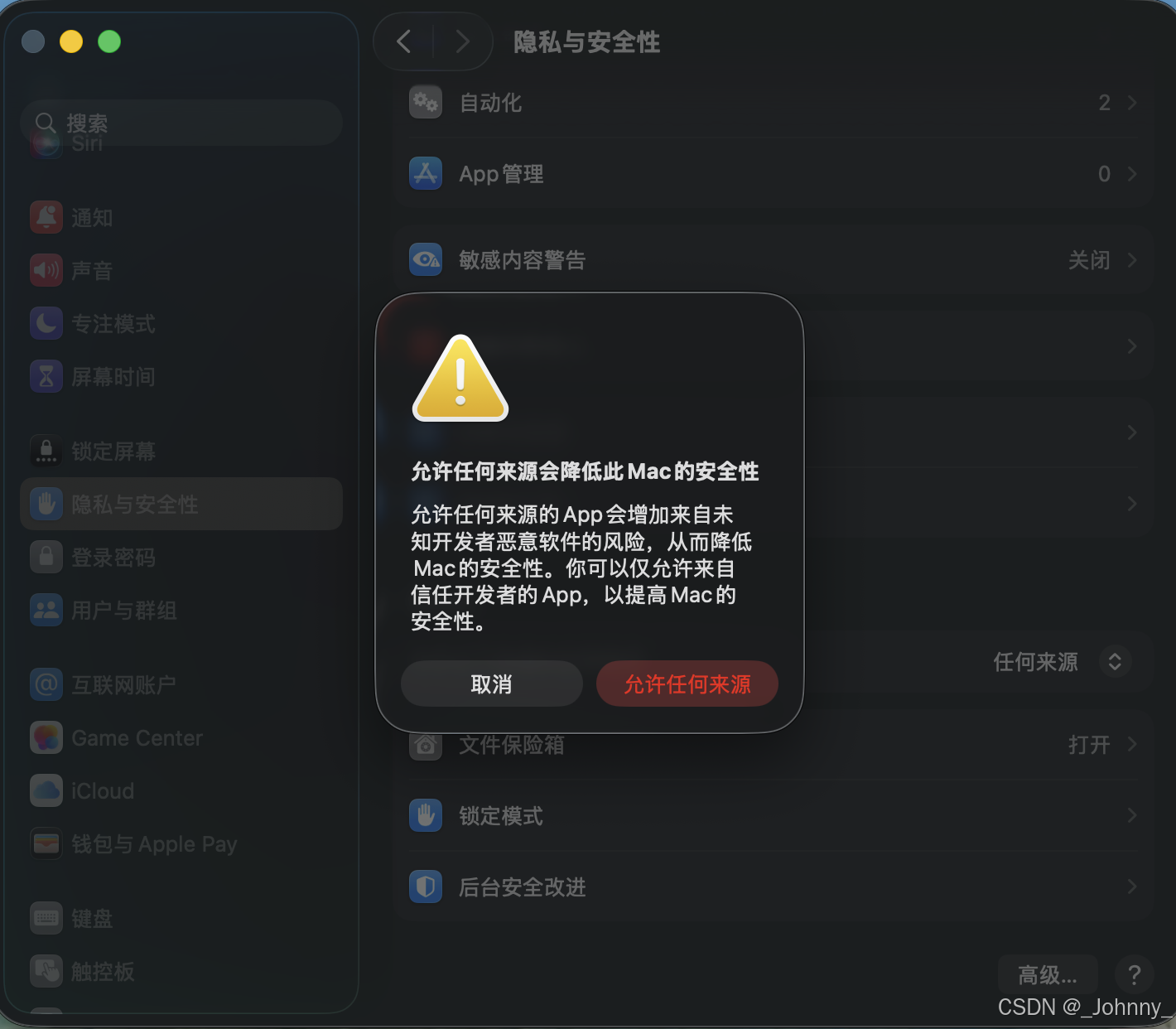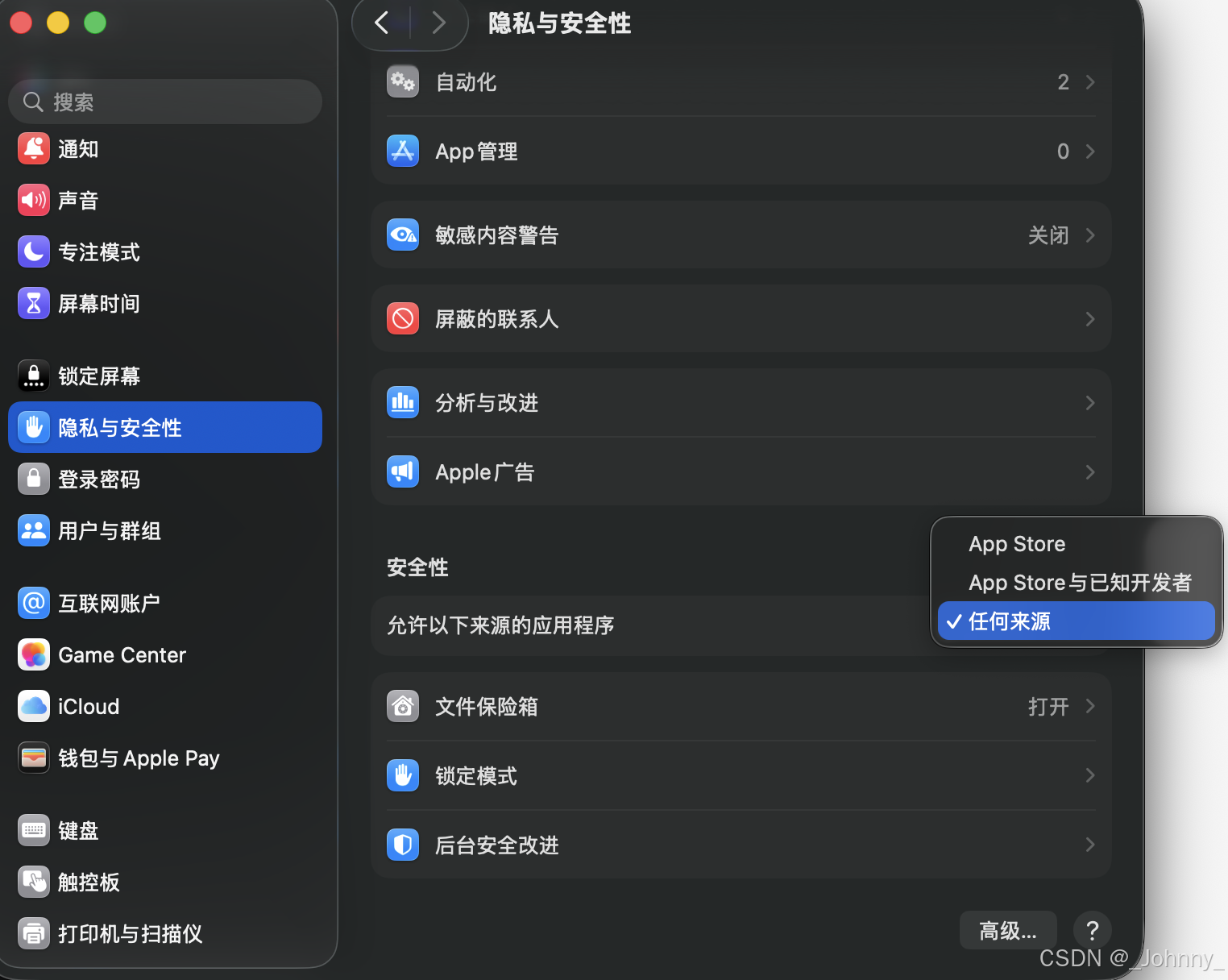 以上操作是为了打开:设置 -- 隐私与安全性 中的"任何来源"选项,默认是隐藏的