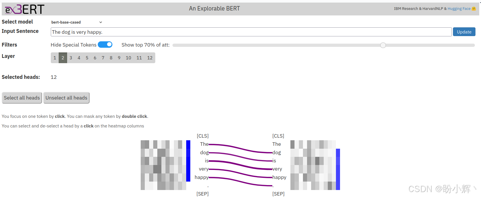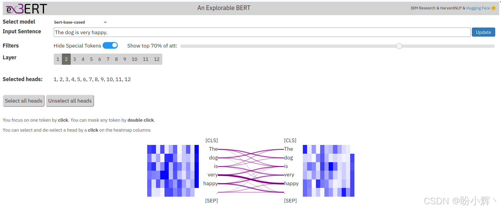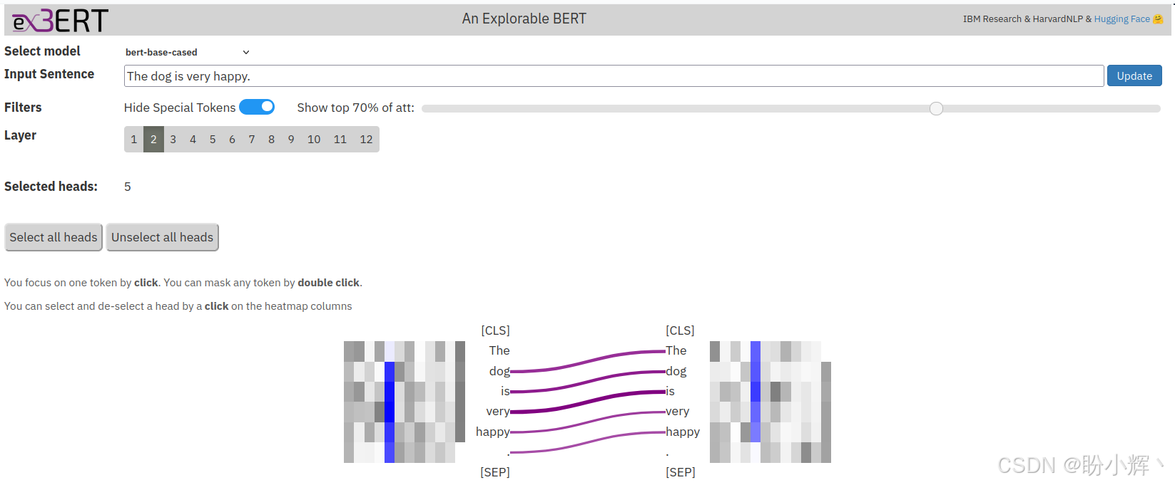 exBERT 是一个用于查看 Transformer 内部结构的可视化工具。我们将使用它来可视化 BERT-base-cased 模型的注意力头。BERT-base-cased 模型包含 12 层,每层有 12 个自注意力头,总共有 144 个自注意力头。接下来,我们将学习如何使用 exBERT。