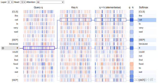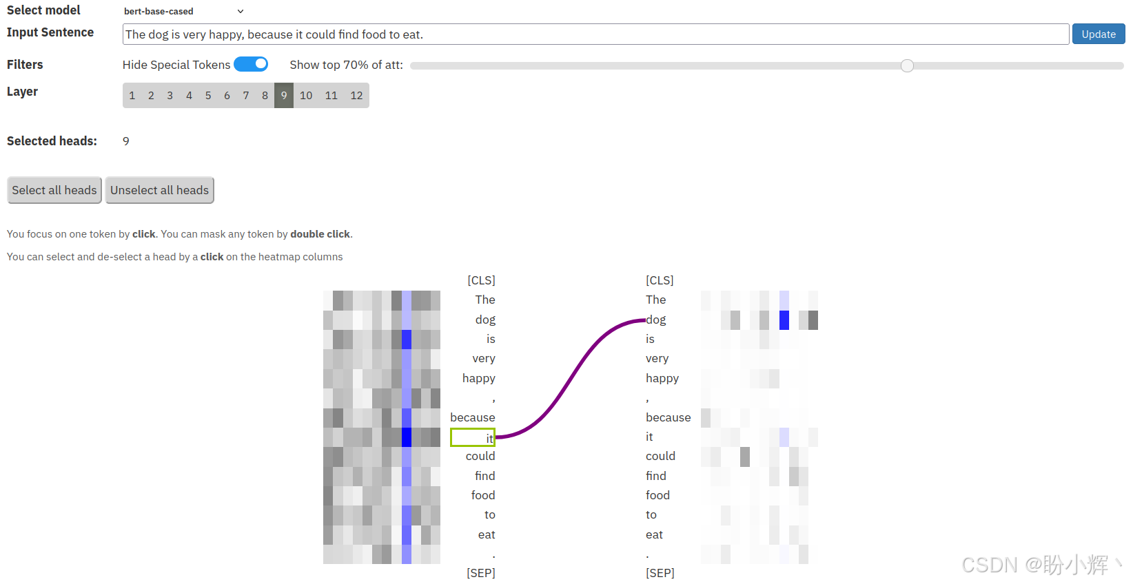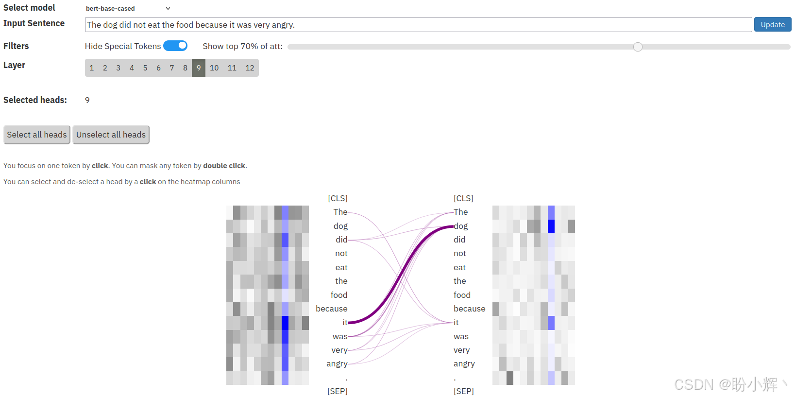 BertViz 支持三种视图:注意力头视图 (attention head view)、模型视图 (model view) 和神经元视图 (neuron view)。首先需要指出的是,在 exBERT 中从 1 开始索引层和注意力头,而在 BertViz 中,从 0 开始进行索引。因此,在 exBERT 中 <9,9> 注意力头在 BertViz 中对应的是 <8,8>。