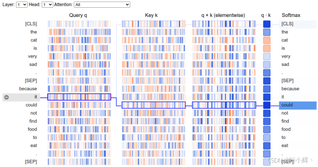 该视图帮助我们追踪从左侧选择的 "it" 词元到右侧其他词元的注意力计算过程。正值显示为蓝色,负值显示为橙色,颜色强度表示数值的大小。"it" 的查询与 "Die" 的键向量非常相似。如果仔细观察这些模式,会发现向量的相似性。因此,它们的点积比其他比较更高,从而在这些词元之间建立了强烈的注意力。我们还可以追踪点积和 softmax 函数的输出。点击左侧的其他词元时,也可以追踪其他计算过程。