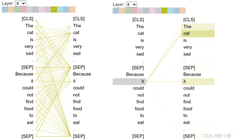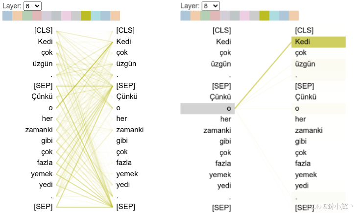 在以上代码中,sentence_a 和 sentence_b 分别表示"猫很伤心"和"因为它吃了太多食物"。当我们将鼠标悬停在 o (它)上时,可以看到其关注 Kedi (猫):