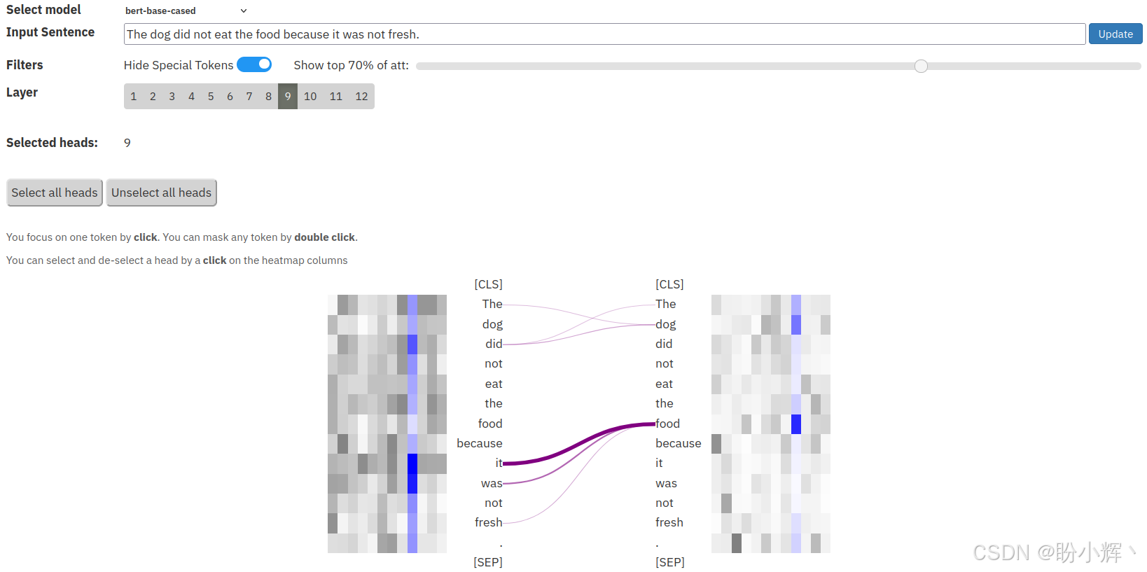从以上截图中,可以看到,代词 "it" 强烈关注它的先行词 "dog"。稍微修改句子,使得 "it" 代词现在指代的是 "food" 词元,而不是 "dog" 词元,如,"The dog did not eat the food because it was not fresh." 如下图所示,涉及到 <9,9> 头,它正确地关注其先行词 "food":