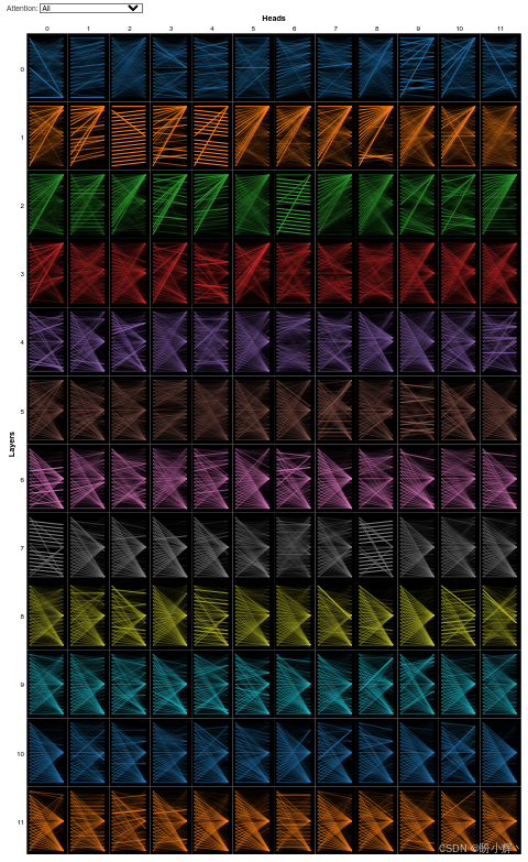 模型视图 (model view) 允许我们从全局视角查看所有注意力头和层的注意力。自注意力头以表格形式展示,行和列分别对应层和头。每个头以可点击的缩略图形式呈现,其中包含了注意力模式的整体形状。