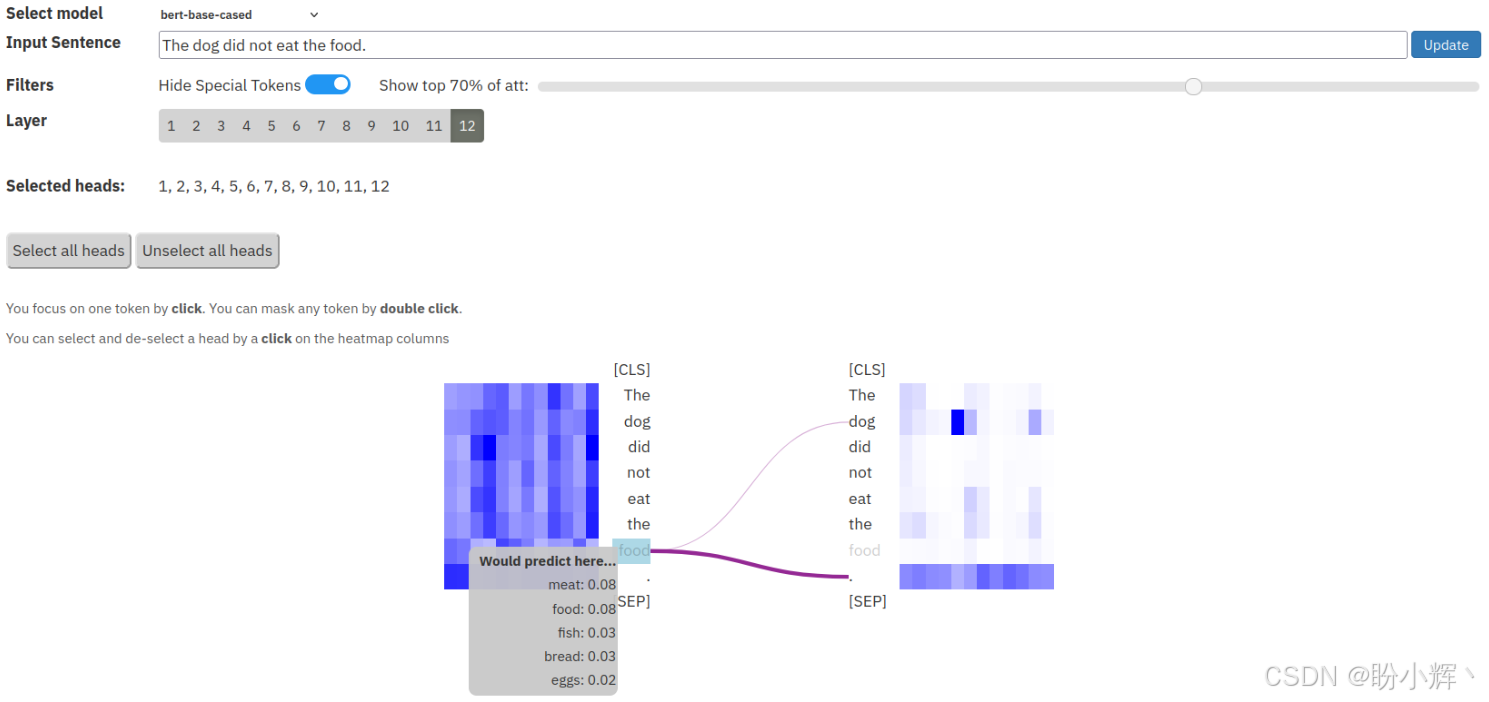 (8) 接下来,我们将以不同的方式使用exBERT模型来评估模型的能力。重新启动 exBERT 界面,选择最后一层(第 12 层),并保留所有注意力头。然后,输入句子:"The dog did not eat the food." 并将 "food" 词元掩码掉。双击可以将 "food" 词元掩码: