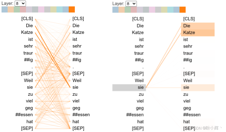 注意力头视图 (attention head view) 是 BertViz 中相当于在上一小节中用 exBERT 所看到的内容。注意力头视图可视化基于选定层中一个或多个注意力头的注意力模式。