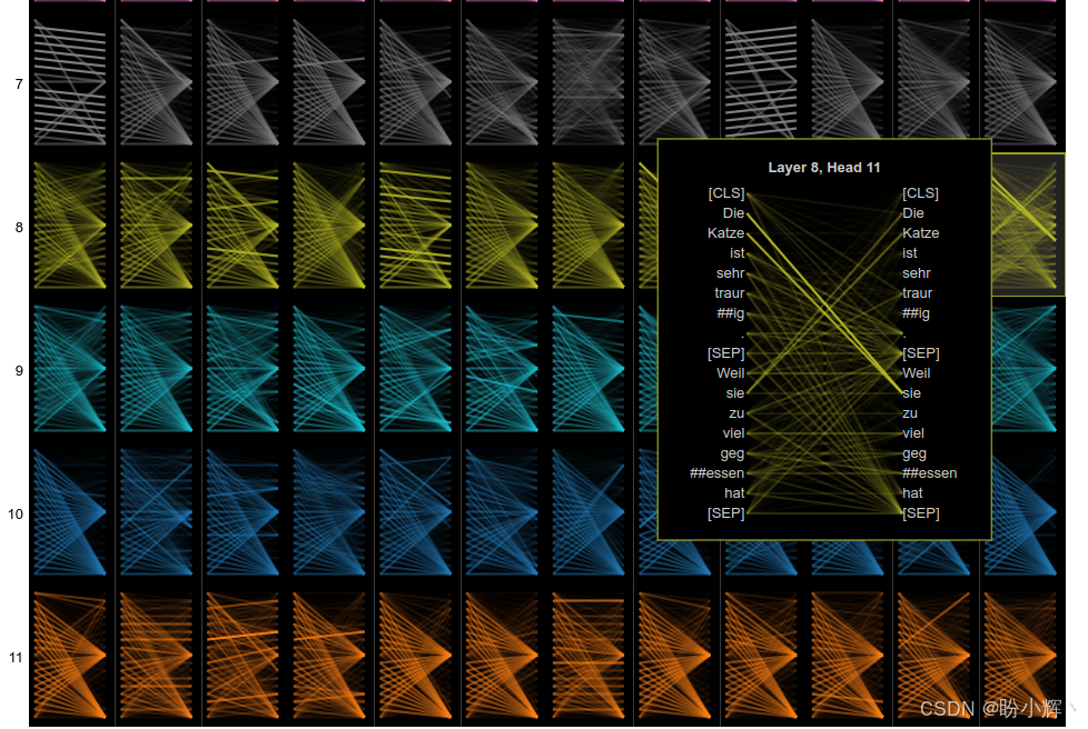 当将鼠标悬停在 "sie" 上时,会看到其关注 "Die Katze" (猫)。虽然这个 <8,11> 头是最强的共指关系注意力头,但这种关系可能扩展到许多其他注意力头。为了观察这一点,我们需要逐一检查所有注意力头。而 BertViz 的模型视图功能提供了一种基本的鸟瞰视图,可以一次性查看所有注意力头。