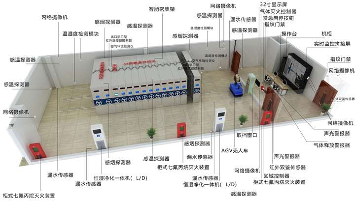 • 灭火配置:采用档案专用新型超细干粉灭火装置,无毒无害、不腐蚀档案,灭火效率高。