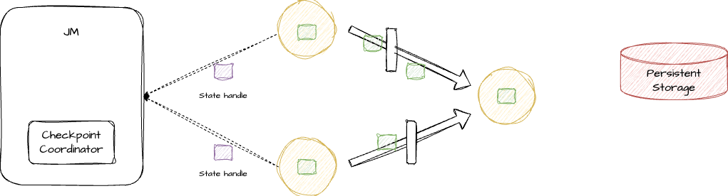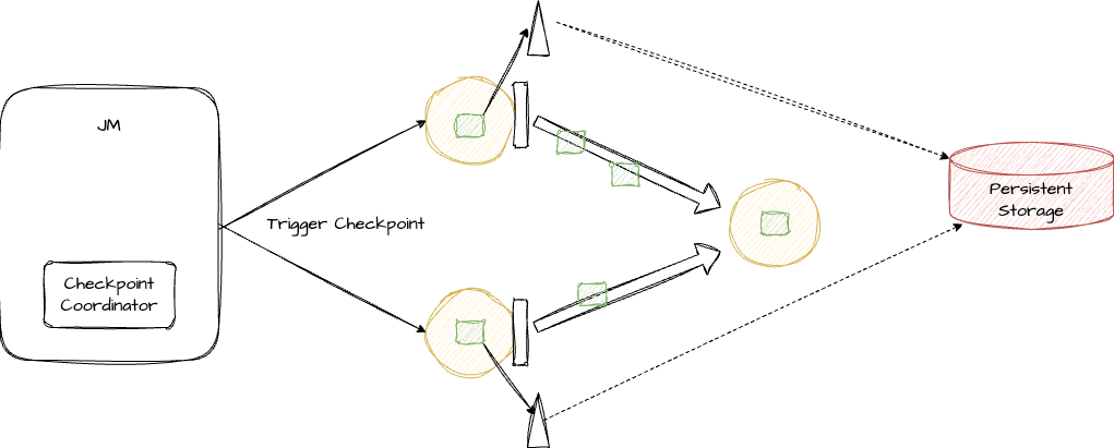 1、Checkpoint Coordinator 触发所有 Source 节点开始 Checkpoint,Source 收到触发命令后,会将自己的 State 进行持久化(图中三角形),并且向下游发送 barrier 事件(图中的小矩形)。当 Source 节点的 State 持久化完成之后,会数据存储的地址发送给 Checkpoint Coordinator。