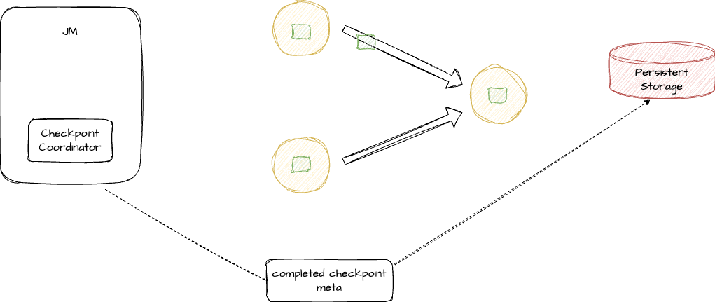 3、当所有的算子都完成持久化过程后,Checkpoint Coordinator 会将一些元数据进行持久化。